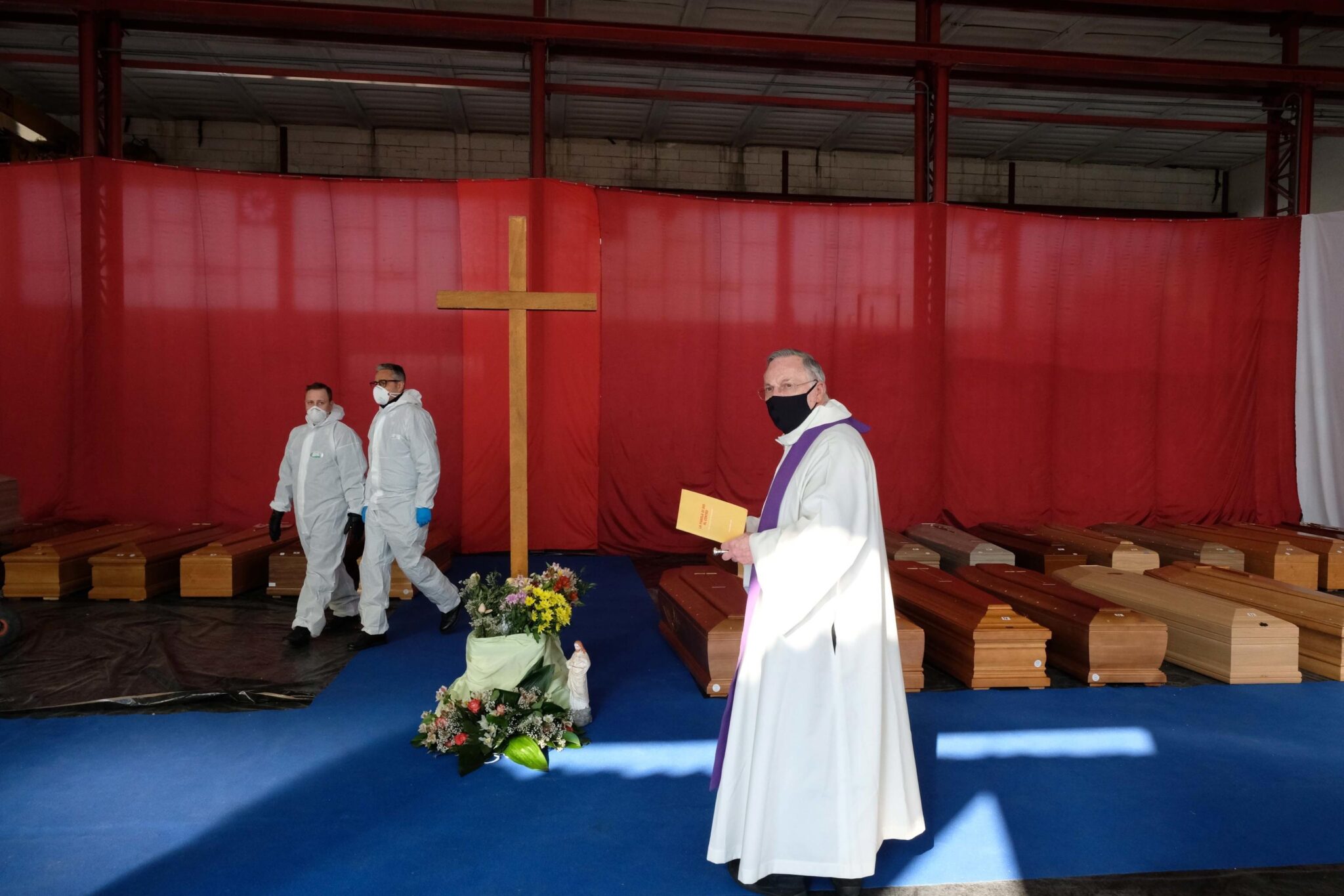 Ponte San Pietro (Italy), 03/04/2020.- A priest wearing a protective face mask blesses the coffins of people who died of coronavirus, before they are taken away to the crematory ovens in other Italian regions with military trucks, in Ponte San Pietro, near Bergamo, northern Italy, 03 April 2020. Italy is under lockdown in an attempt to stop the widespread of the SARS-CoV-2 coronavirus which causes the Covid-19 disease. (Italia) EFE/EPA/FILIPPO VENEZIA