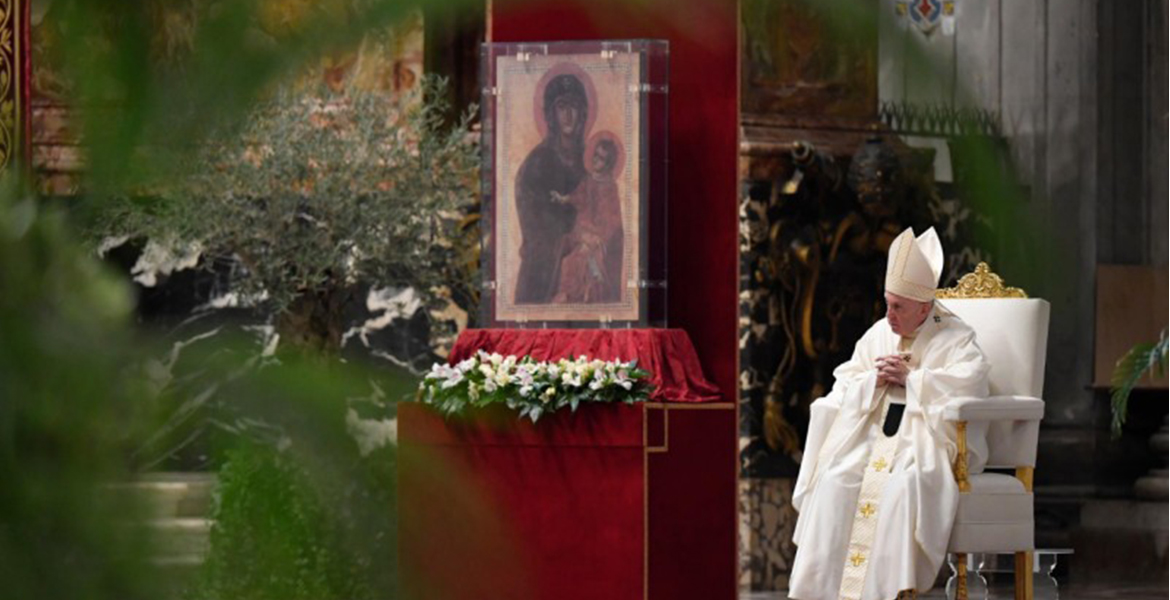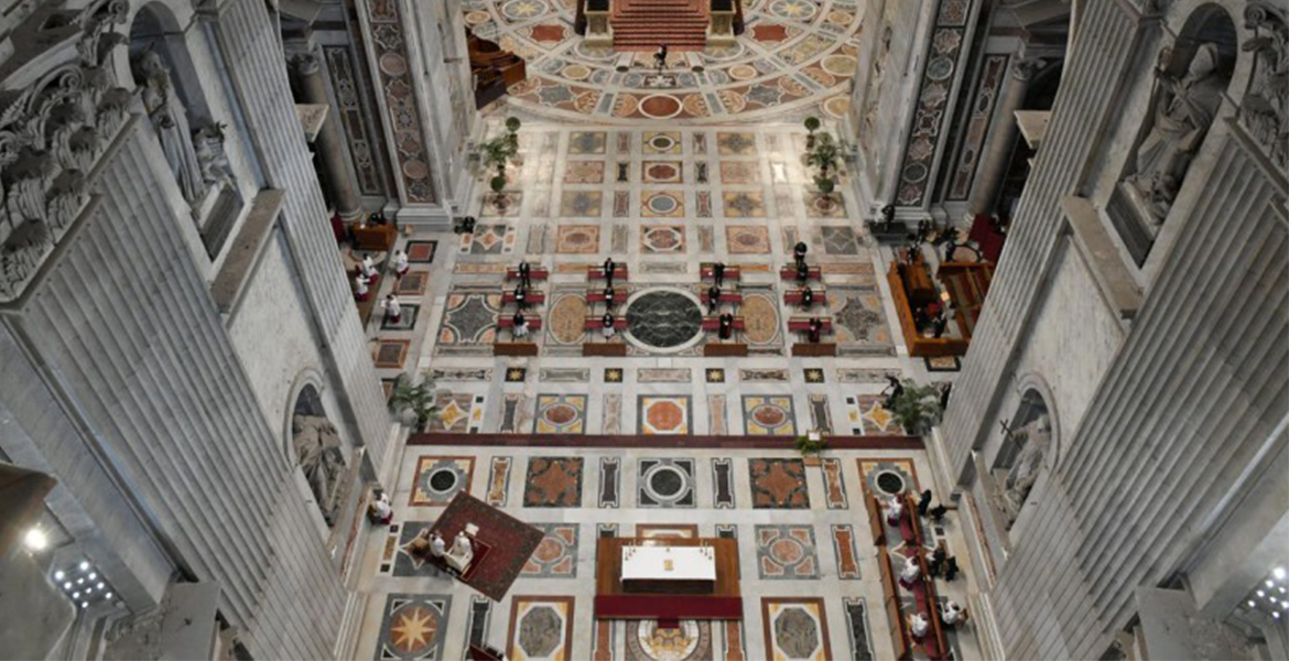 En la eucaristía, que se ha desarrollado con el mínimo número de fieles, en el altar de la Cátedra de San Pedro se han respetado las normas sanitarias manteniendo la distancia entre los participantes o suprimiendo el ya de por sí opcional lavatorio de los pies. Tampoco se ha producido la procesión con las ofrendas o el traslado del Santísimo Sacramento al monumento al final de la celebración. Como ocurrió el pasado Domingo de Ramos, junto al altar de han colocado el Cristo de san Marcelo ante el que Roma pidió el fin de la peste en el XVI y el icono de la Virgen María de la Salud, ‘Salus Populi Romano’, auténtico símbolo durante toda esta pandemia.