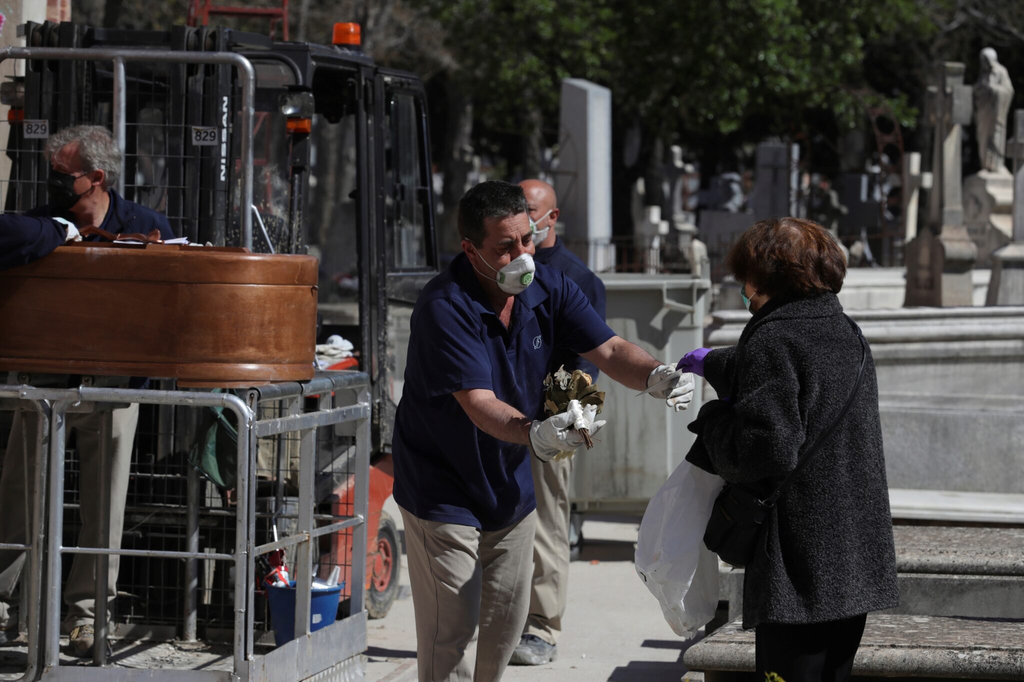 GRAF5540. MADRID, 04/04/2020.- Una mujer entrega un ramo de flores y un sobre a uno de los operarios que proceden al entierro de su ser querido en el cementerio de la Almudena en Madrid, este sábado. Las comitivas a los cementerios para enterramiento o despedida de cremación han quedado restringidas a un máximo de tres familiares o allegados del fallecido, además del ministro de culto o persona asimilada de la confesión respectiva para la práctica de los ritos funerarios de despedida del difunto. EFE/JuanJo Martín