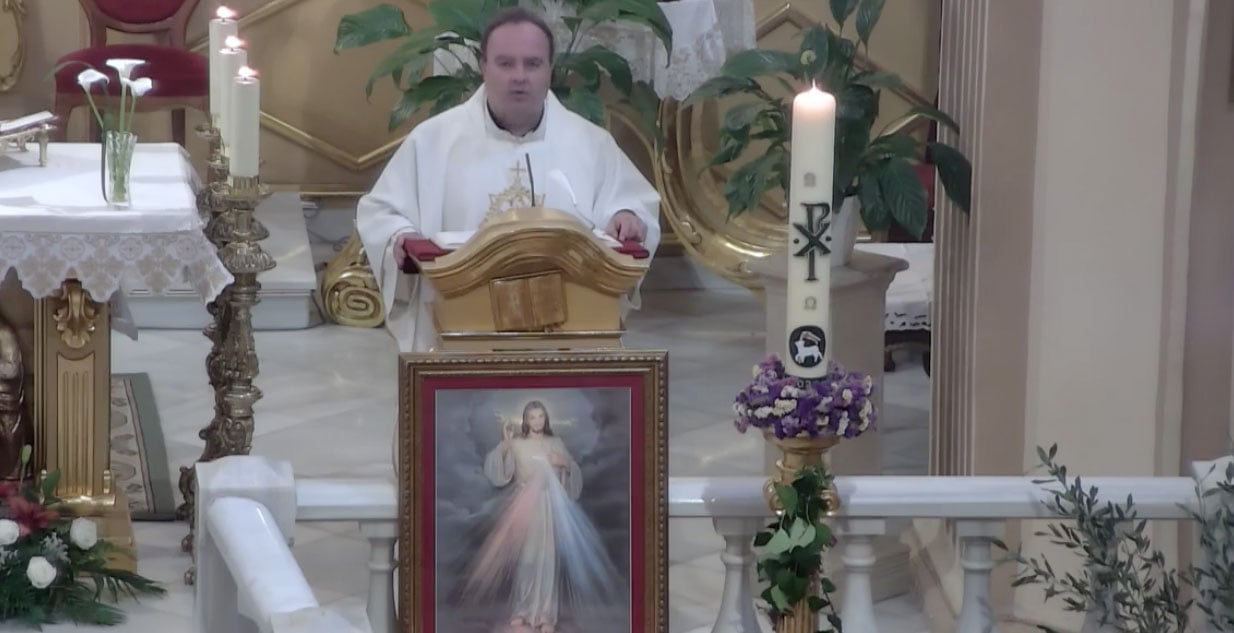 Misa del Domingo de la Divina Misericordia. Celebración retransmitida en directo por Telearchena, televisión local de Murcia. El celebrante, el párroco de la localidad y vicario episcopal de Cieza-Yecla (Diócesis de Cartagena), Alfonso Albuquerque. En su homilía, tras poner en valor el trabajo de los sanitarios, el sacerdote entra en materia para, en cinco minutos, cargar contra la supuesta persecución del Gobierno a la Iglesia, el ocultismo con las cifras de fallecidos a causa del coronavirus y el también supuesto espionaje gubernamental a los teléfonos móviles de los españoles, curas incluidos.