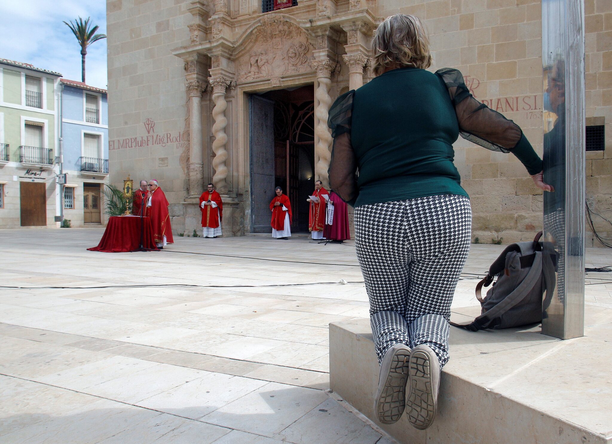 GRAFCVA4365. ALICANTE, 23/04/2020.- Una mujer se arrodilla ante la reliquia de la Santa Faz que ha salido a las puertas de la iglesia para la bendición de todos los peregrinos, que hoy no han podido realizar el trayecto entre Alicante y el Caserío de la Santa Faz, al haberse suspendido la tradicional romería debido al estado de alarma por el Covid-19. EFE/Pep Morell
