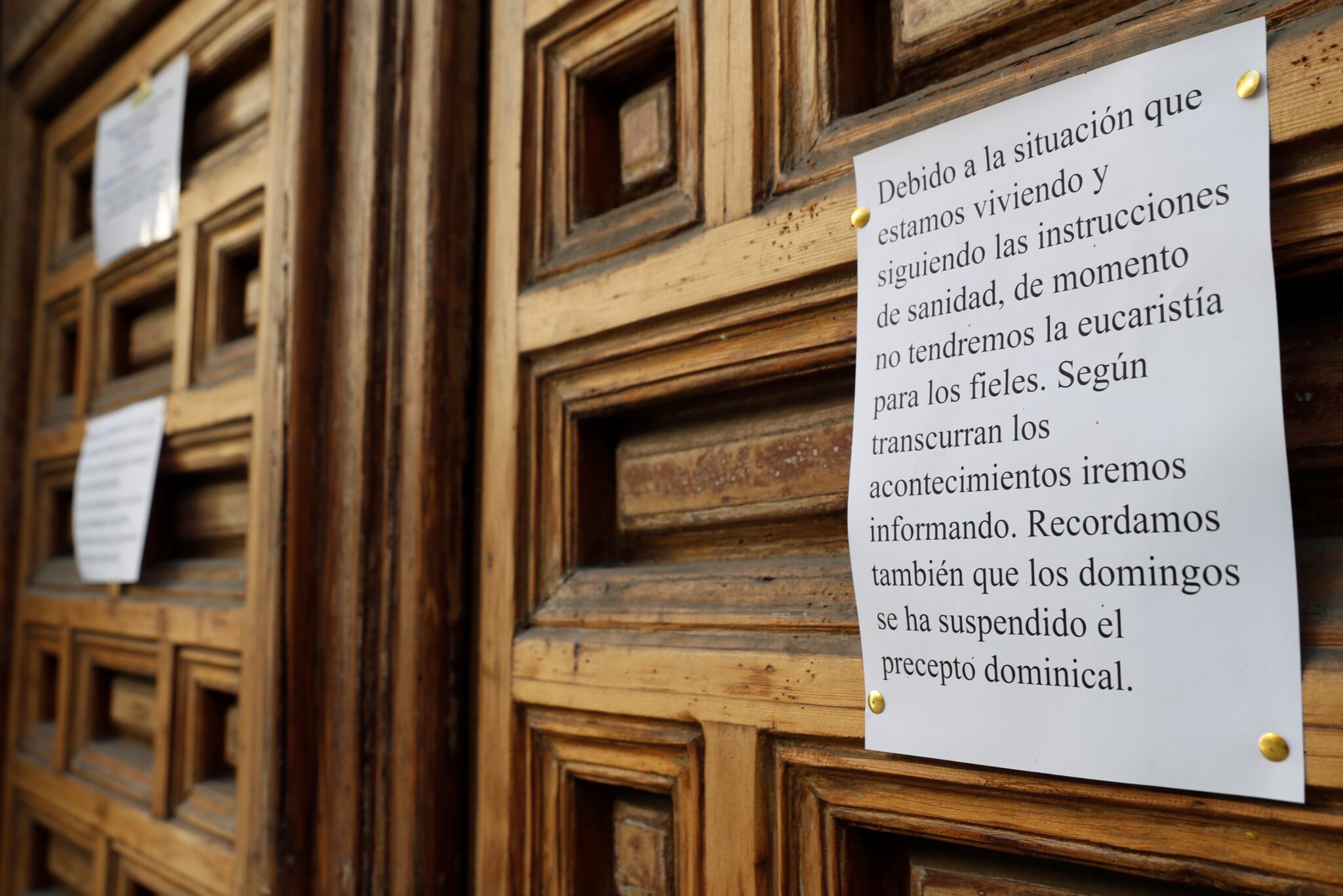GRAF7001. MADRID, 15/03/2020.- Carteles de información que advierten del cierre de la iglesia de San Antonio de los Alemanes en Madrid debido al coronavirus, este domingo. La crisis del coronavirus ha producido la cancelación de las misas en Madrid con participación de fieles, pero las iglesias podrán seguir abiertas para quienes deseen acudir a rezar, extremando, eso sí, las precauciones. EFE/ J.j. Guillén