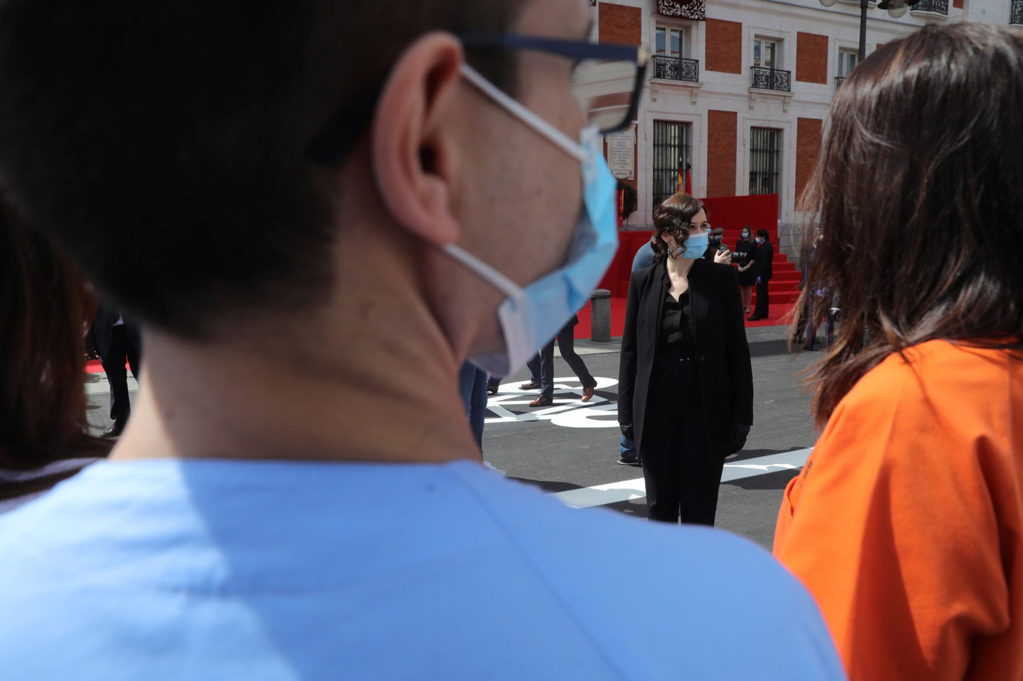 GRAF9388. MADRID, 02/05/2020.- La presidenta de la Comunidad de Madrid, Isabel Díaz Ayuso (c), conversa con varios sanitarios, durante las celebraciones de la fiesta de la Comunidad de Madrid, este sábado 2 de mayo, en la Puerta del Sol. EFE/JuanJo Martín POOL