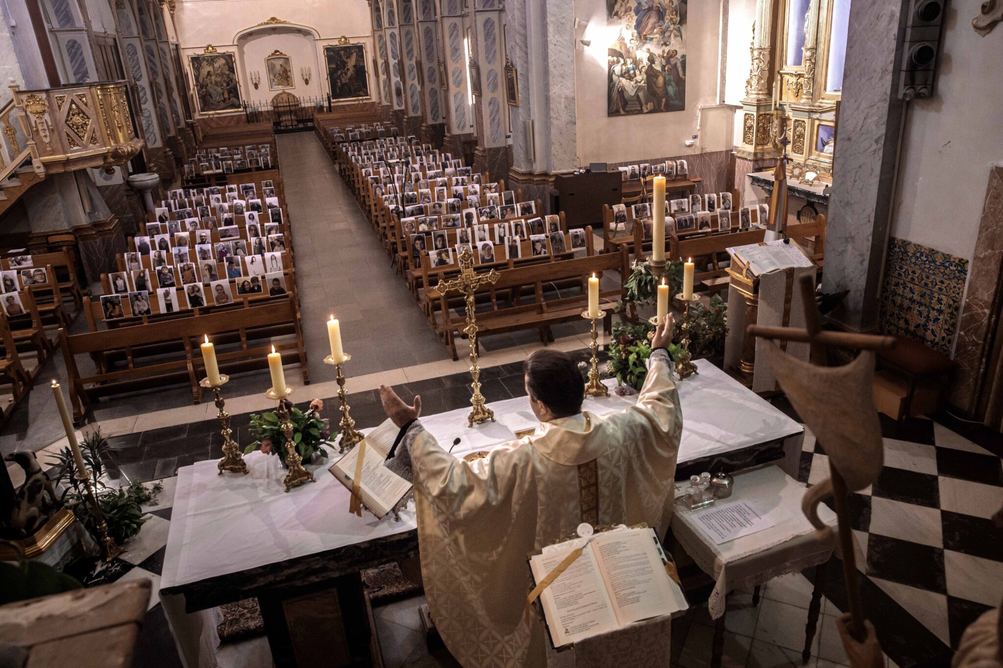 -FOTODELDIA- GRAFCVA4422. VILLAR DEL ARZOBISPO (VALENCIA), 25/04/2020.- El sacerdote de Villar del Arzobispo, Raúl García, celebra las misas con las fotografías que mas de 250 de sus feligreses le han mandado, para que le acompañen desde los bancos y le dan "calor humano". EFE/Biel Aliño