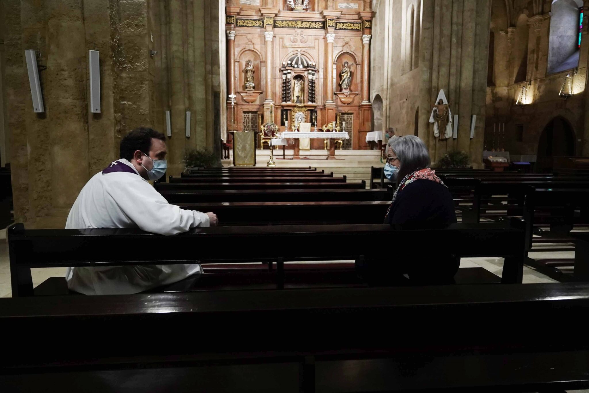 GRAFAND8229. CÓRDOBA, 07/05/2020. El párroco de la iglesia de San Miguel de Córdoba, atiende a una feligresa con mascarillas ambos y respetando las medidas de seguridad, en la fase 0 de la desescalada los templos permanecen cerrados y solo hay atención religiosa personalizada. EFE /Rafa Alcaide