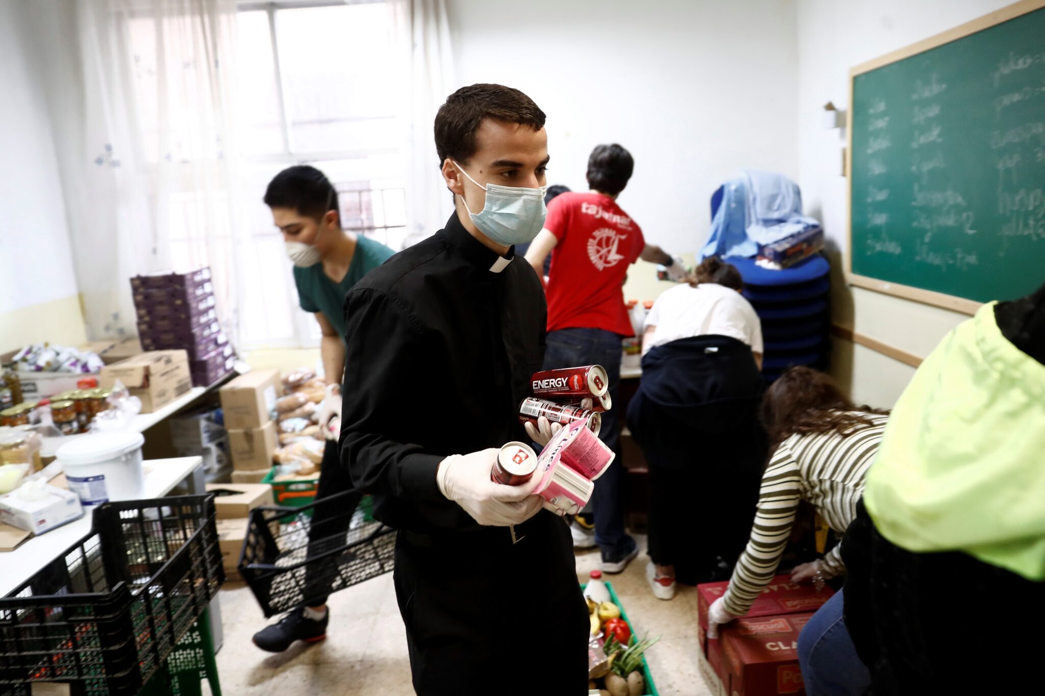 MADRID, 25/04/2020.- Voluntarios reparten alimentos en la parroquia San Ramón Nonato, en Puente de Vallecas, este sábado, cuadragésimo segundo día del estado de alarma por el coronavirus.EFE/Mariscal