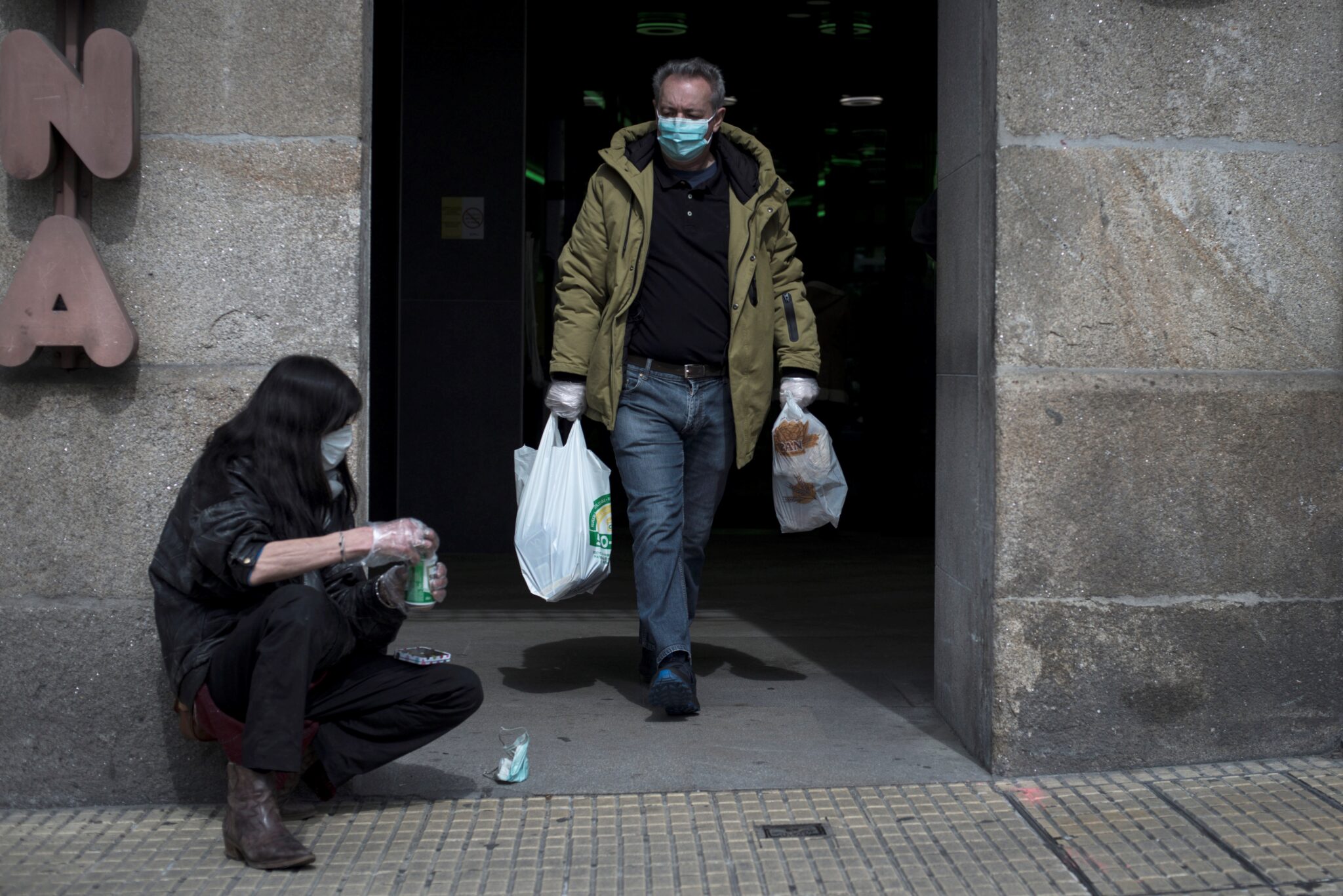 GRAF2758. ORENSE, 28/03/2020.- Un hombre pasa ante una mujer sin recursos a la salida de un supermercado en Ourense, Galicia registra 2.627 casos de infectados por coronavirus, de los que 110 están en la UCI, 652 en planta hospitalaria y el resto, 1.865 en sus domicilios.-EFE/Brais Lorenzo