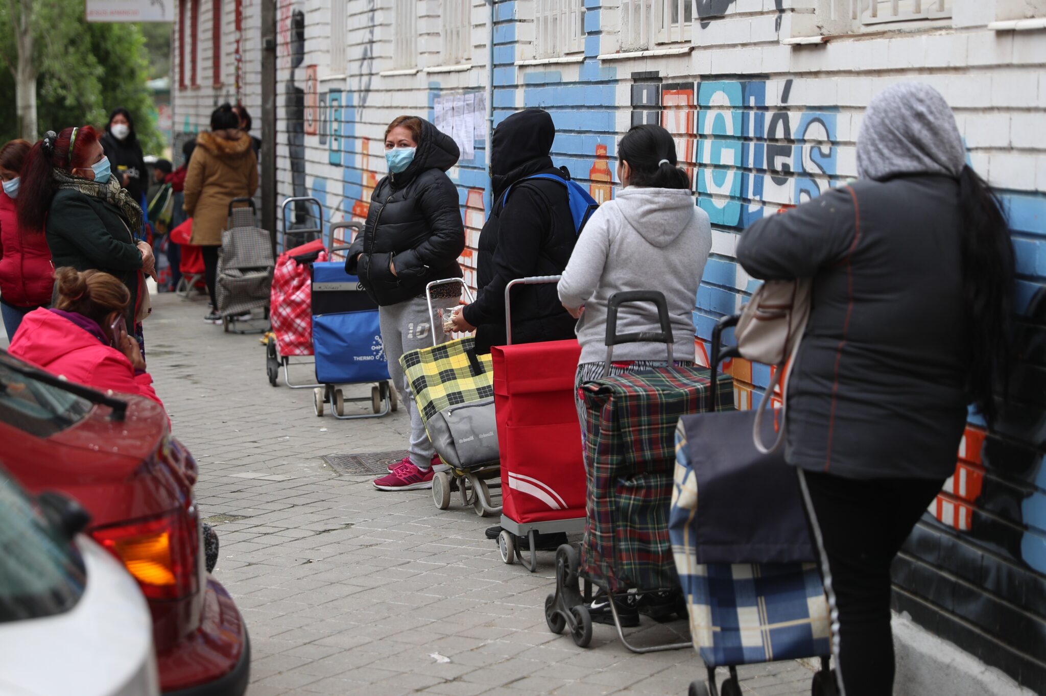 GRAF6164. MADRID, 16/05/2020.-Varias personas esperan en la fila para recoger alimentos proporcionados por la Asociación de vecinos de Aluche, debido a la difícil situación de muchas familias de Aluche provocada por la pandemia, centenares de personas de este barrio madrileño acuden diariamente a recoger algo de comida para sus familias .-EFE/Rodrigo Jiménez