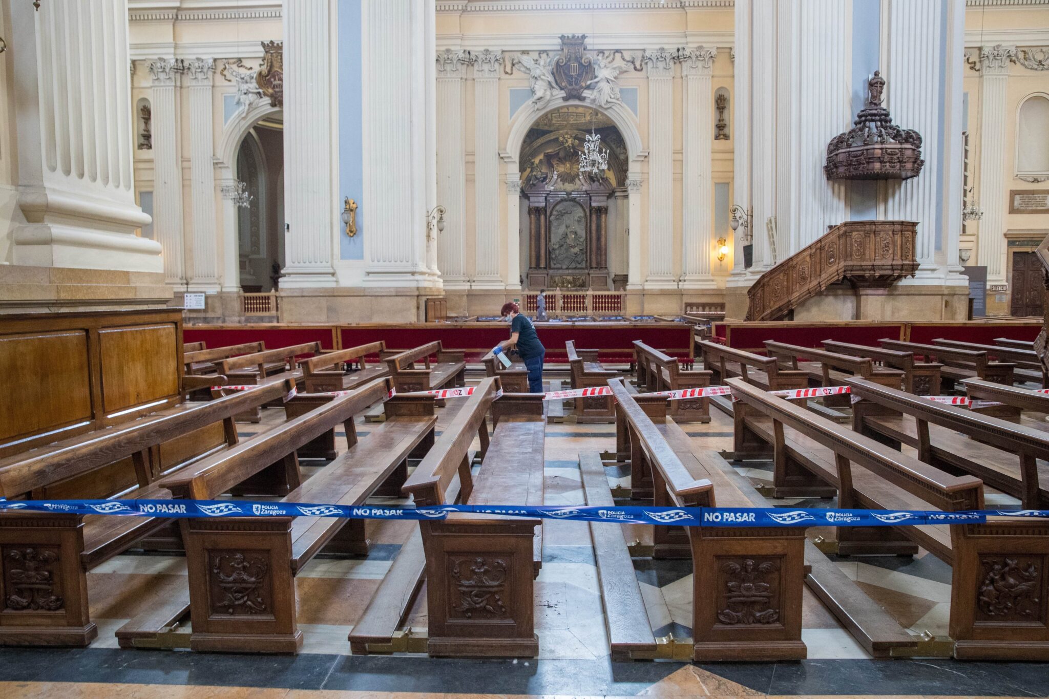 GRAF2676. ZARAGOZA, 08/05/2020.- Una mujer trabaja en las labores de limpieza y reorganización de la Basílica del Pilar en Zaragoza, este viernes, para poder abrir el templo al culto público tan pronto como Zaragoza entre en la Fase 1 de la desescalada. EFE/Javier Cebollada