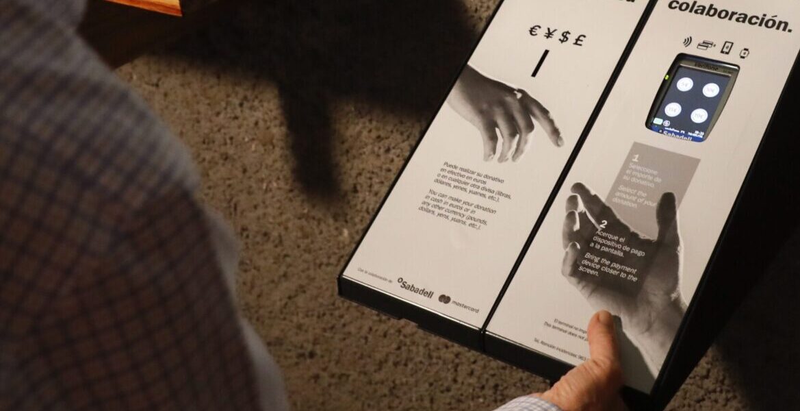 ¿La alternativa a la colecta suprimida del ofertorio? A la salida, a través del atril DONE, con la colaboración de Banco Sabadell, que permite donativos con tarjeta sin contacto ni tener que teclear número secreto de hasta 45 euros.