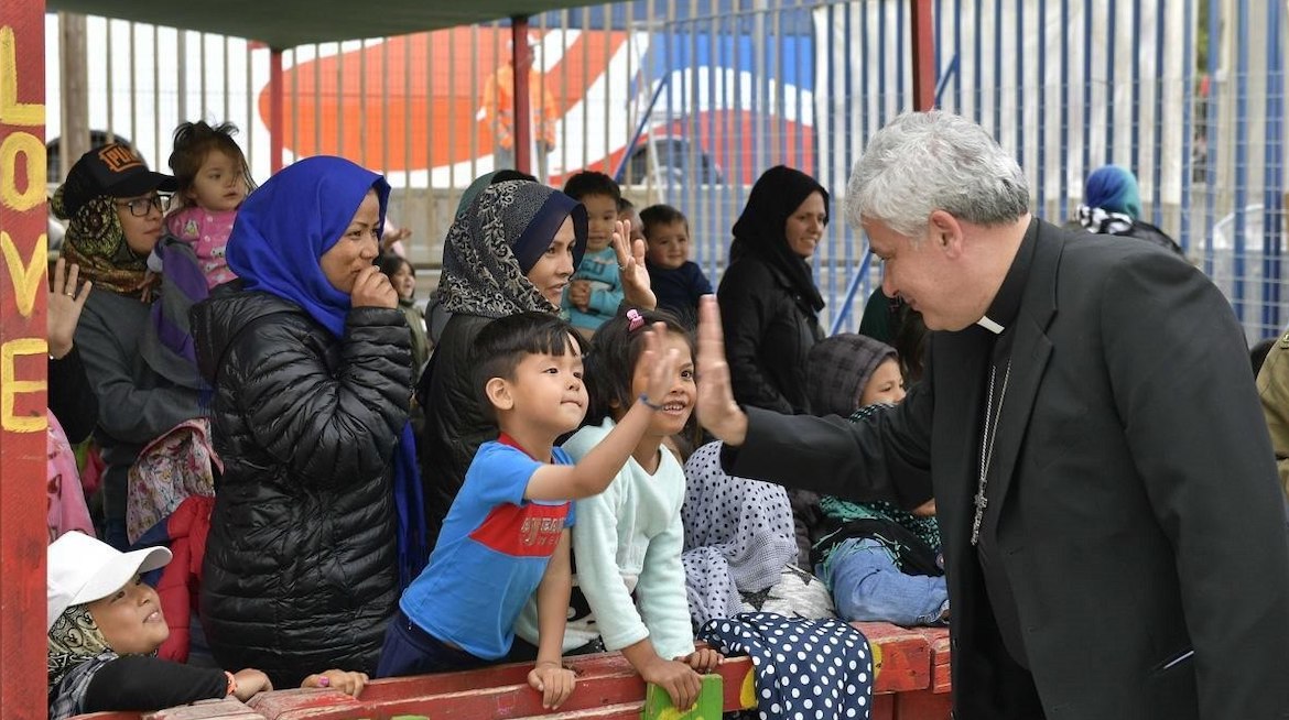 EPA1172. ISLAS GRIEGAS, 09/05/2019.- El limosnero del papa Francisco, el cardenal polaco Konrad Krajewski (d),saluda a un niño durante su visita a un campamento de refugiados en las islas griegas, este jueves, en Grecia. EFE/ Oficina De Prensa Del Vaticano SÓLO USO EDITORIAL, NO VENTAS