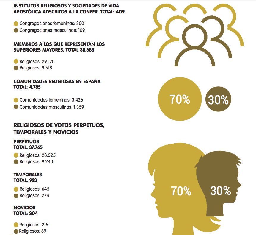 El número de monjas y monjes de clausura cae en 420 religiosos con respecto al año anterior (408 contemplativas y 12 religiosos menos). Si en 2018 el número de religiosos contemplativos sumaba 9.151 miembros en nuestros conventos, la cifra cerrado el año se sitúa en los 8.731 religiosos. De estos, son mayoría femenina, situándose en 8.273 religiosas y 458 religiosos.