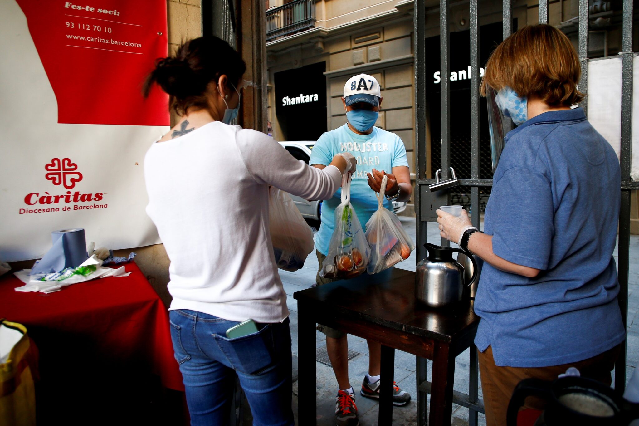 GRAFCAT6618. BARCELONA, 18/05/2020.- Voluntarios de la parroquia de Santa Anna de Barcelona reparten comida para más de 200 personas este lunes, sexagésimo quinto día del estado de alarma por la pandemia de coronavirus, que esta provocando que entidades como el Banco de Alimentos haya aumentado por 4 las peticiones de ayuda alimentaria, a la vez que han surgido multitud de iniciativas solidarias para proveer de alimentos a la población más vulnerable. EFE/Quique Garcia