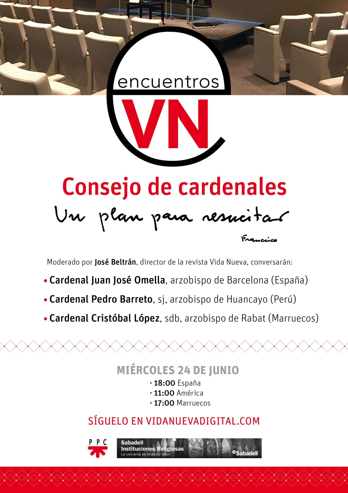 Vida Nueva presenta el próximo 24 de junio una mesa redonda online bajo el título ‘Consejo de cardenales: un plan para resucitar’. El III Encuentro Vida Nueva, organizado por la revista, con la colaboración de PPC y de la mano de Banco Sabadell, será en esta ocasión online, debido a las limitaciones de aforo que ofrece la pandemia del coronavirus. Por primera vez, el evento podrá ser seguido desde cualquier parte del mundo a través de esta web. Será a las 18:00 horas (España), 17:00 horas (Marruecos y Canarias) y 11:00 horas (América Latina).