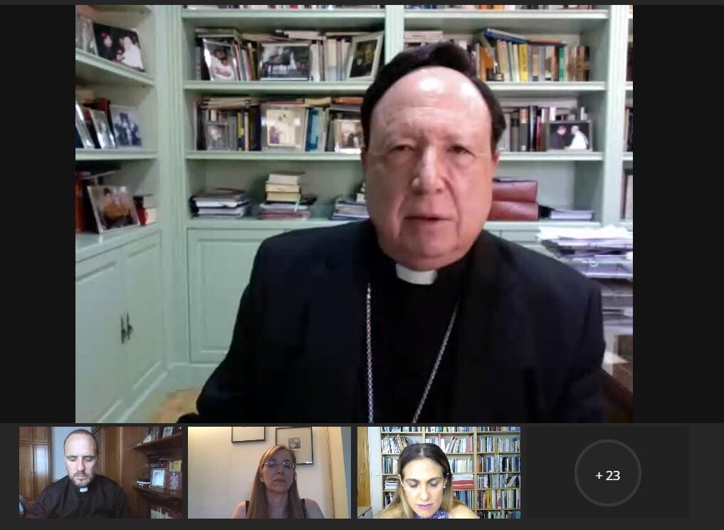 Junto al obispo castrense han estado en el acto la rectora de la UPSA, Mirian de las Mercedes Cortés Diéguez, la decana de la Facultad de Comunicación, Carmen María Alonso; la directora del curso, la profesora Gloria García; y el secretario de la comisión episcopal, José Gabriel Vera. En la distancia han presentado a los 11 alumnos conectados el trasfondo y novedades de este curso.