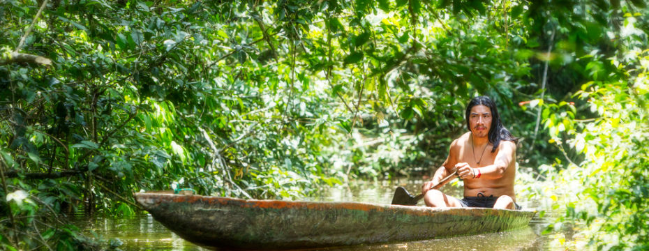 Indigenous Adult Man On Typical Wooden Canoe Chopped From A Single Tree Navigating Murky Waters Of Ecuadorian Amazonian Primary Jungle