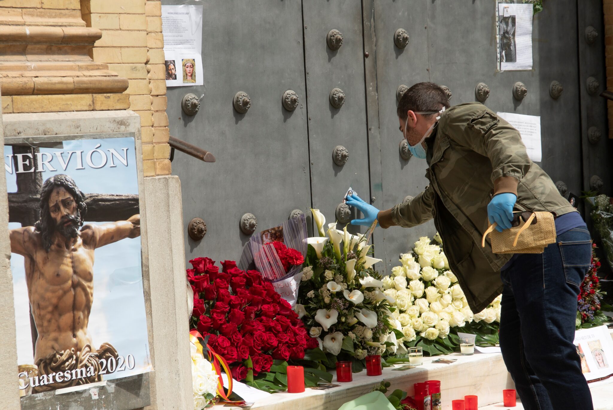 -FOTODELDÍA- GRAFAND7212. SEVILLA, 08/04/2020.- Un vecino deja una estampa en la puerta de la parroquia de Concepción Inmaculada de Sevilla, de la que tendría que haber salido en procesión hoy, Miércoles Santo, la cofradía de La Sed, en una Semana Santa sin procesiones a causa del estado de alarma decretado por el gobierno para frenar el avance del coronavirus. EFE/ Raúl Caro