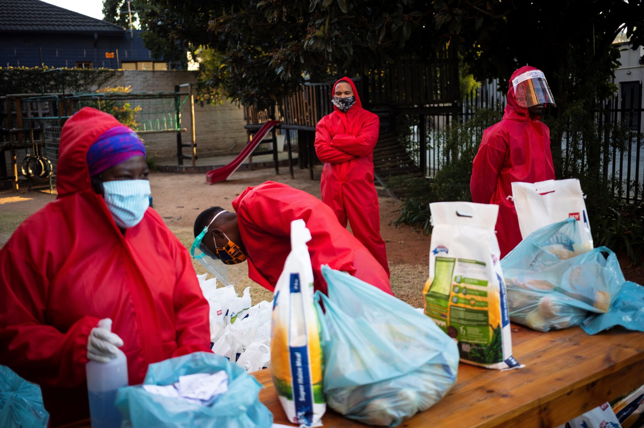 Johannesburg (South Africa), 23/07/2020.- Volunteers wait to feed local people during the weekly feeding scheme at the Heritage Baptist Church in Melville on the 118 day of lockdown due to the Covid-19 Coronavirus, Johannesburg, South Africa, 23 July 2020. With a huge increase in Covid-19 corona virus infections and deaths now occurring in South Africa, food insecurity remains a massive issue. These volunteers from the area and working for the Viva Foundation wore full PPE suites to protect themselves while helping feed approximately 500 people per week at the church. (Sudáfrica, Johannesburgo) EFE/EPA/KIM LUDBROOK