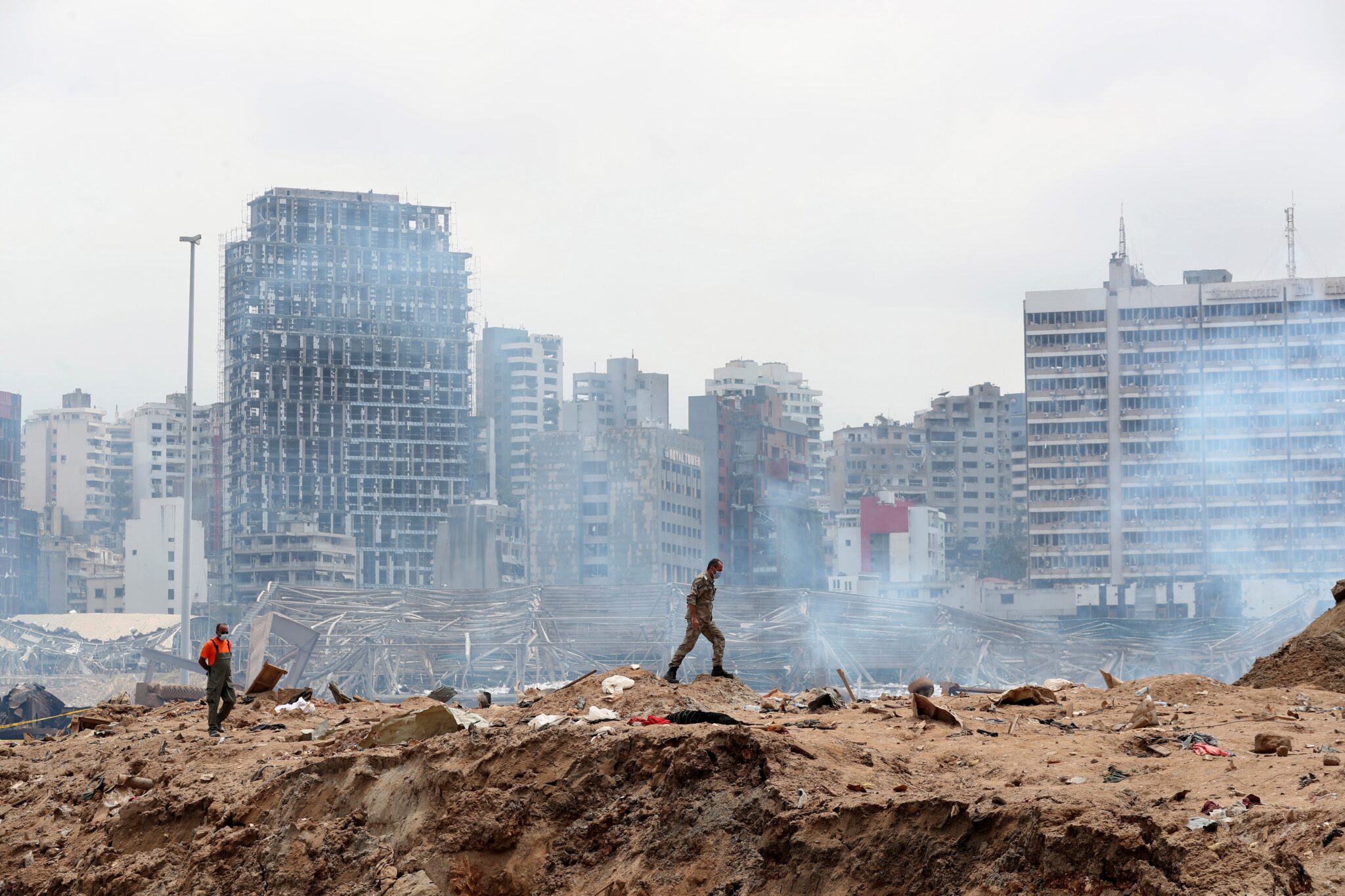 Beirut (Lebanon), 06/08/2020.- A soldier walks at the devastated site of the explosion in the port of Beirut, Lebanon, 06 August 2020. French President Emmanuel Macron arrived to Lebanon to show support after a massive explosion on 04 August in which at least 135 people were killed, and more than 5,000 injured in what believed to have been caused by an estimated 2,750 of ammonium nitrate stored in a warehouse. (Francia, Líbano) EFE/EPA/Thibault Camus / POOL MAXPPP OUT