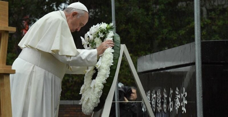 “Uno de los anhelos más profundos del corazón humano es el deseo de paz y estabilidad. La posesión de armas nucleares y de otras armas de destrucción masiva no son la respuesta más acertada a este deseo; es más, parecen continuamente ponerlo a prueba. Nuestro mundo vive la perversa dicotomía de querer defender y garantizar la estabilidad y la paz en base a una falsa seguridad sustentada por una mentalidad de miedo y desconfianza, que termina por envenenar las relaciones entre pueblos e impedir todo posible diálogo”, clamó Francisco en su ‘Discurso sobre las armas nucleares’ en el Parque del epicentro de la bomba atómica en Nagasaki el 24 de noviembre de 2019.