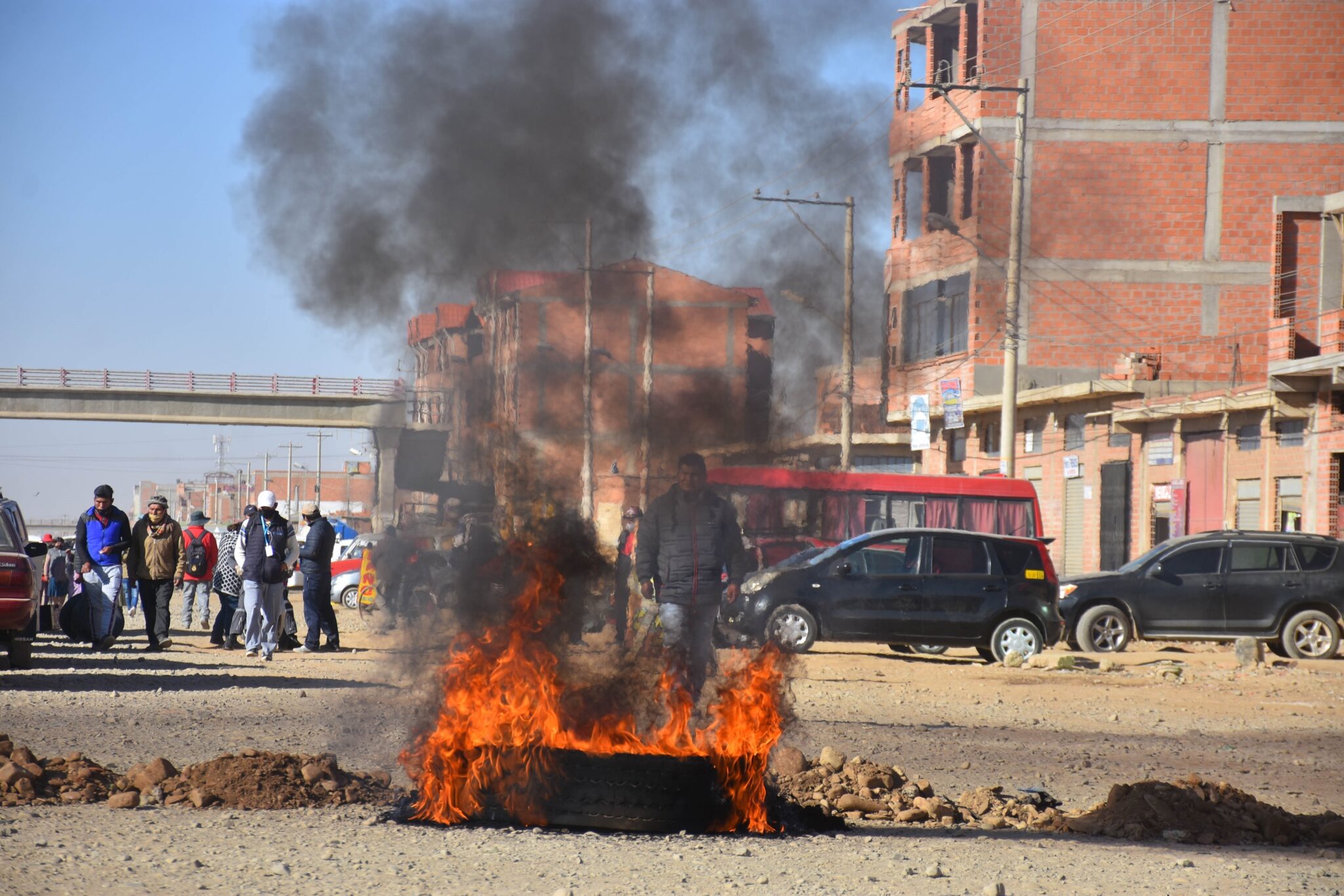 Un grupo de personas bloquean una carretera durante una protesta debido al nuevo aplazamiento de las elecciones bolivianas, el pasado 3 de agosto, en El Alto (Bolivia). EFE/Stringer