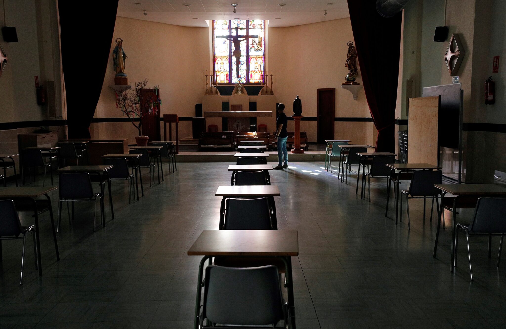 GRAFCVA7457. VALENCIA, 26/08/2020.- Miguel Ángel Mora, director del colegio concertado Pio XII de Valéncia, muestra la capilla del centro que ha sido reconvertido en aula de segundo de bachillerato. Colegios e institutos de la Comunitat Valenciana han tenido que adaptar rápidamente algunas de sus dependencias, desde gimnasios y capillas hasta laboratorios, salones de actos y pasillos, para que sean aulas y comedores con garantías sanitarias en la inminente "vuelta al cole". EFE/Manuel Bruque