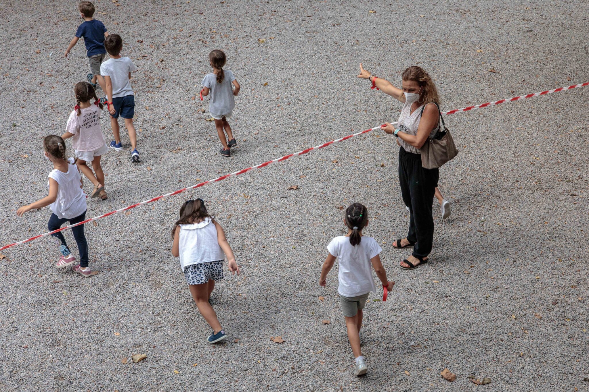 GRAFCVA7664. VALENCIA, 07/09/2020.- . Varios niños y niñas del colegio Jesús y María de Valencia, se dirigen a la zona acotada para el recreo, durante el primer día de clase para 794.243 alumnos y 4.374 profesores de 1.425 centros públicos y 420 concertados de la Comunitat Valenciana en un "excepcional" inicio de curso, marcado por las medidas sanitarias que impone la pandemia de coronavirus y la incertidumbre de su impacto y evolución. EFE/Biel Aliño
