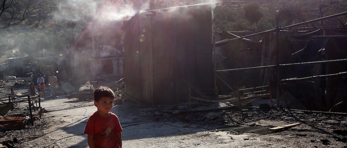 Moria (Greece), 09/09/2020.- A child walks among debris in the Moria refugees camp on the island of Lesbos, Greece, 09 September 2020. According to reports, a fire broke out at Moria Camp early on 09 September, after approximately 35 refugees, who had tested positive for COVID-19, refused to move into isolation with their families. (Incendio, Grecia) EFE/EPA/ORESTIS PANAGIOTOU