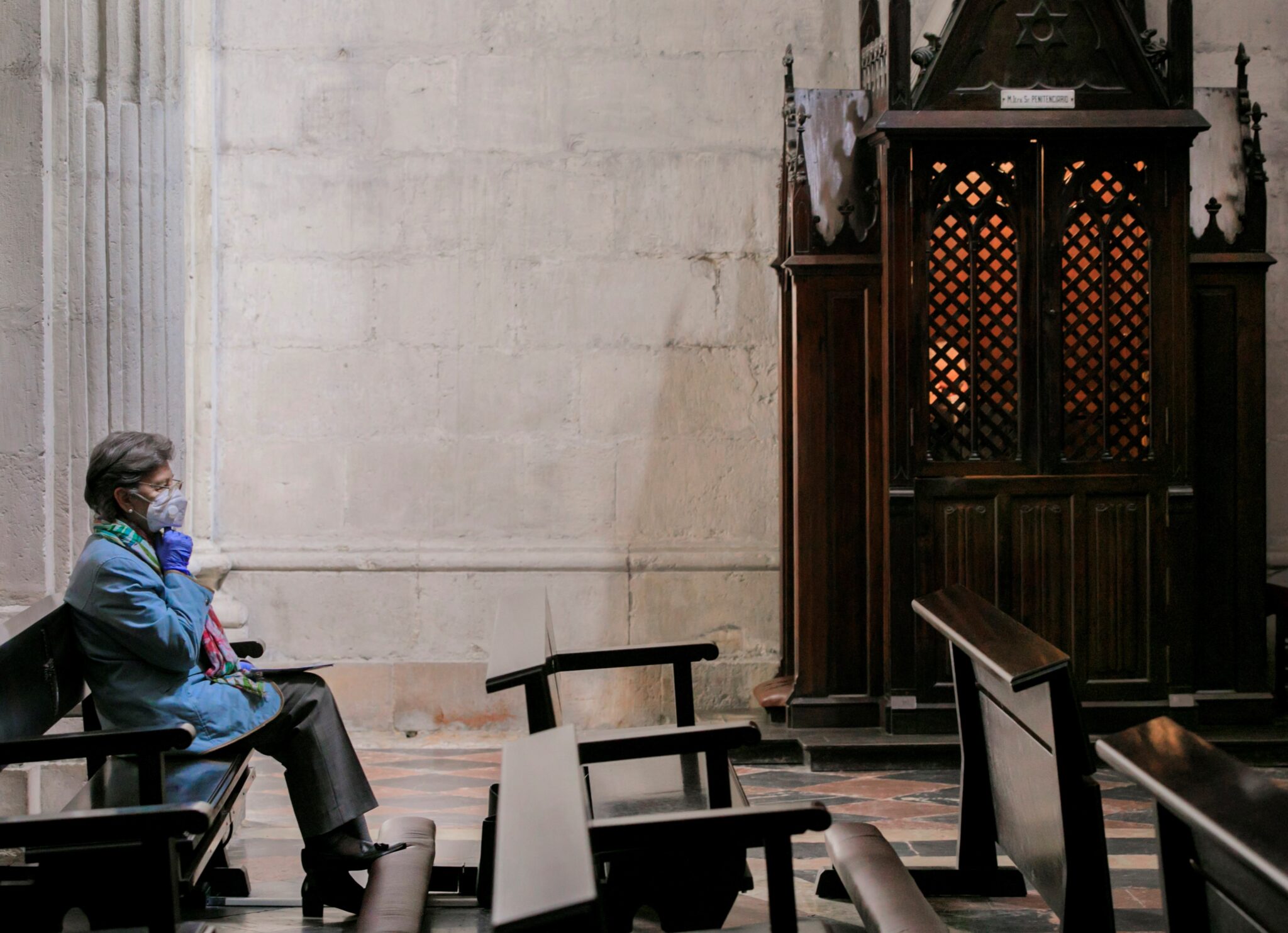 GRAF7505. OVIEDO, 18/05/2020.- Una mujer espera en la catedral de Oviedo a confesarse antes del inicio de la misa de 12, este lunes. El presidente del Principado de Asturias, Adrián Barbón, ha reiterado hoy su criterio favorable a la medida sobre la extensión del uso de mascarillas en espacios públicos. EFE/ Alberto Morante