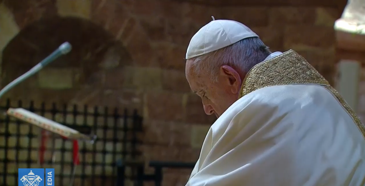 Francisco celebró la misa en el altar sobre el que descansan los restos de san Francisco, de espaldas a los fieles, pero se giró en el rito de la paz para compartir el gesto con los allí presentes, así como para rezar con ellos el ‘Cordero de Dios’. Acompañaron al Obispo de Roma en la misa una treintena de personas, debido a las restricciones de aforo exigidas por la pandemia del coronavirus.