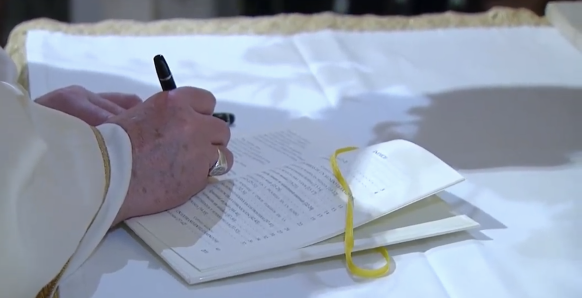 A las cuatro menos cinco de la tarde del sábado 3 de octubre el Papa estampaba su firma sobre la tercera encíclica de su pontificado: ‘Fratelli tutti’. Y lo hacía sobre el altar donde descansan los restos de San Francisco de Asís, al que ha encomendado, no solo su Pontificado, sino que ha sido el punto de partida para elaborar un texto que, de alguna manera, busca ser una hoja de ruta para un mundo en pandemia.