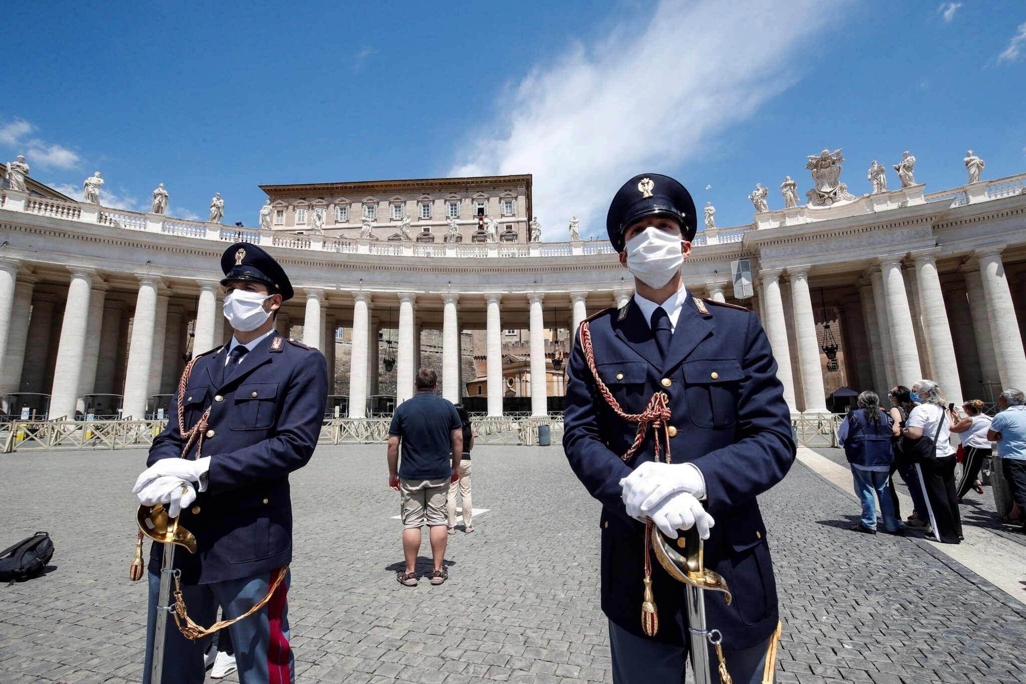 Vatican City (Vatican City State (holy See)), 07/06/2020.- Italian Policemen wearing protective face masks stand guard in St. Peter's Square during the Angelus prayer of Pope Francis, Vatican City, 07 June 2020. (Papa) EFE/EPA/GIUSEPPE LAMI