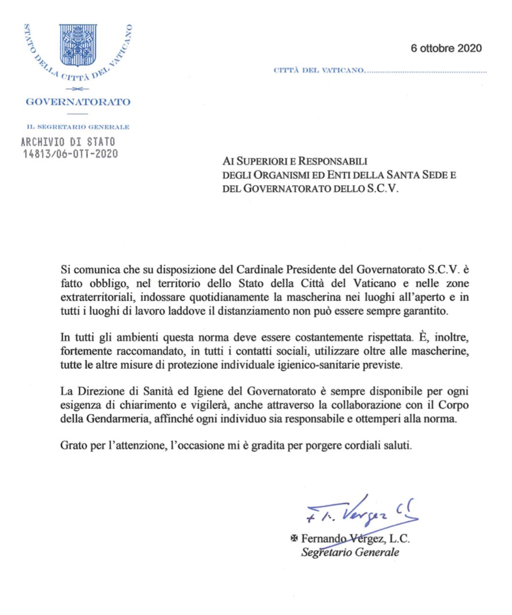 Las mascarillas ya son obligatorias en el Vaticano. La Santa Sede entra de lleno en la ‘nueva normalidad’ tras los peores meses de la pandemia obligando a todos sus ciudadanos y visitantes a llevar la mascarilla tanto en lugares abiertos como cerrados. Así lo ha decretado el Governatorato de la Ciudad del Vaticano, según una disposición hecha pública hoy y firmada por el secretario del Governatorato, Fernando Vérgez, LC.