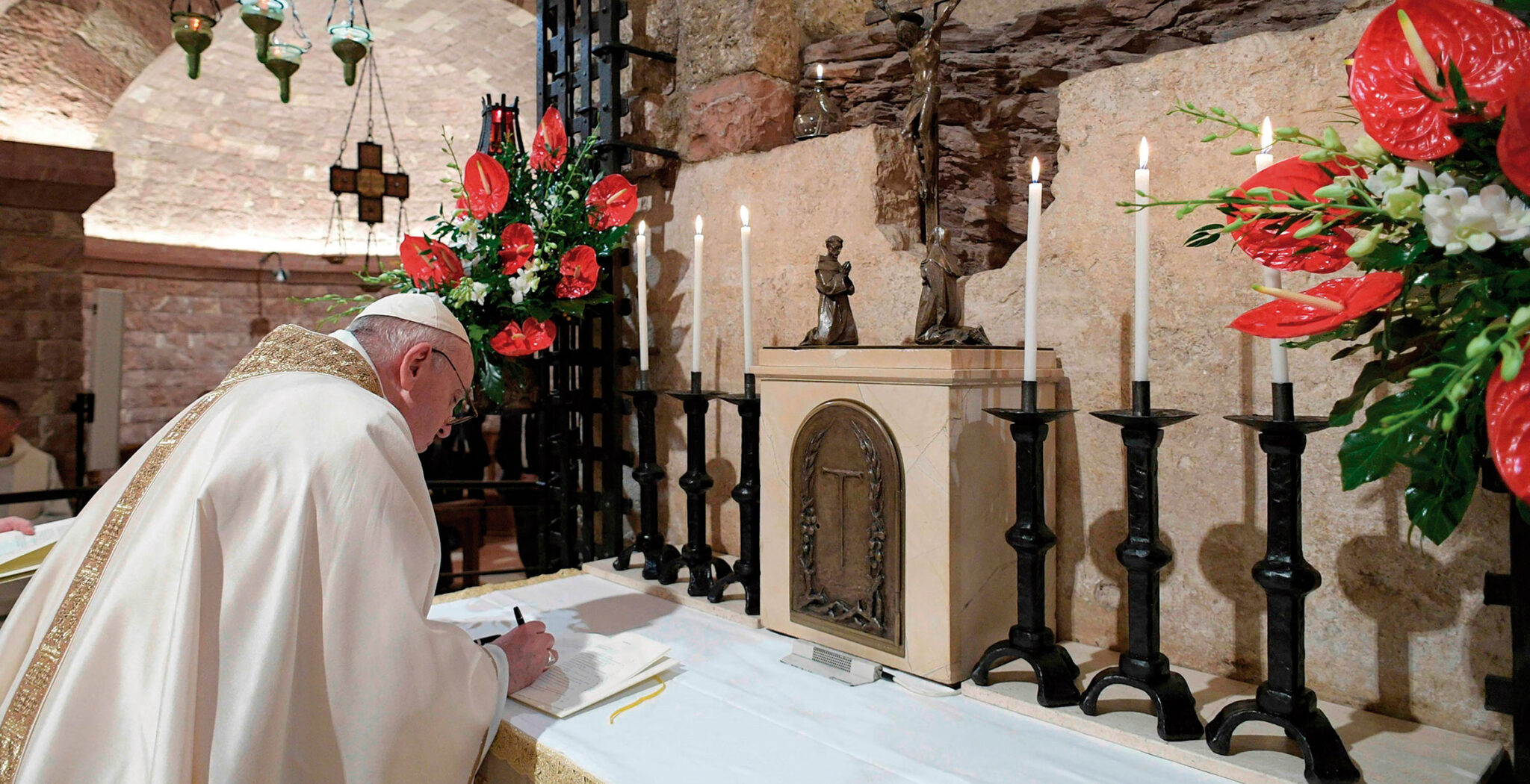 Ya en Asís, a las tres de la tarde, celebró la Eucaristía ante la tumba de san Francisco, situada en la cripta de la basílica inferior. Una celebración muy sencilla –sin mitra ni báculo– y a la que solo asistieron una treintena de personas, en su mayor parte miembros de la comunidad franciscana. Al final y sobre el altar, firmó tres ejemplares de la encíclica que le presentó Paolo Braida, jefe de la Primera Sección de la Secretaría de Estado, responsable de las traducciones y discursos papales.