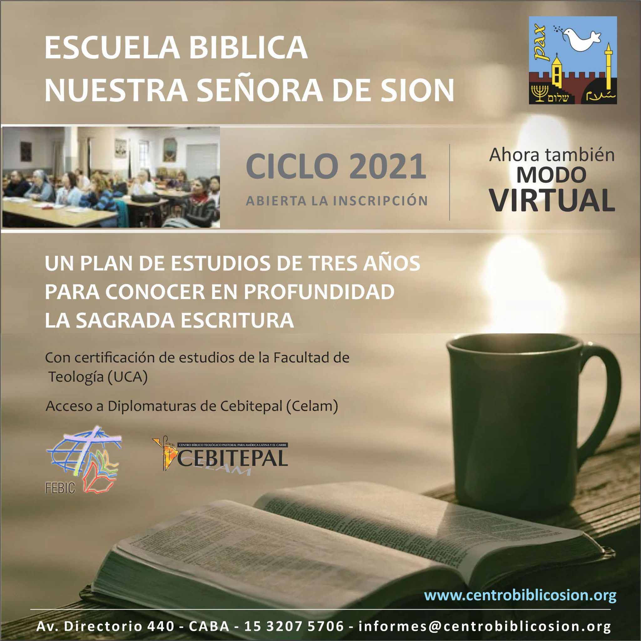 Las inscripciones ya están abiertas para el ciclo 2021. Para conocer más información sobre: calendario de clases, fechas, días y horarios de cursada, se puede ingresar a https://www.centrobiblicosion.org/nuevo/escuela-biblica/ o pedir informes al mail: [email protected]