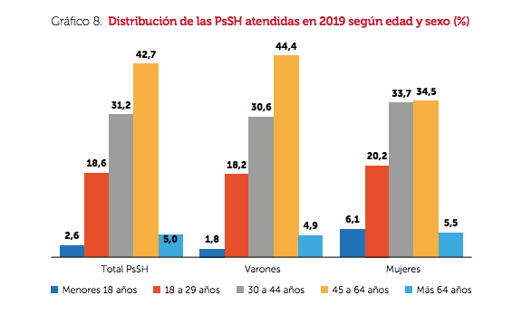 La encuesta revela los distintos perfiles de vulnerabilidad que presentan las personas acompañadas por Cáritas a través de estos recursos. Por ejemplo, la dureza de la realidad que sufren cerca de 7.100 mujeres sin techo, muchas de las que se ven en la calle tras haber sufrido violencia; los más de 1.000 niños, niñas y adolescentes que viven en familias sin vivienda habitual y los 7.300 jóvenes de entre 18 y 29 años, muchos de ellos jóvenes ex tutelados, que salen de los centros de menores sin un alojamiento alternativo; o la extrema fragilidad de los 2.000 mayores de 65 años.