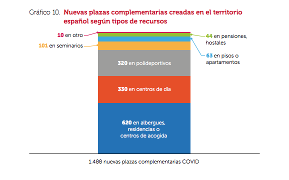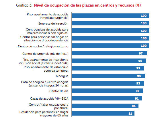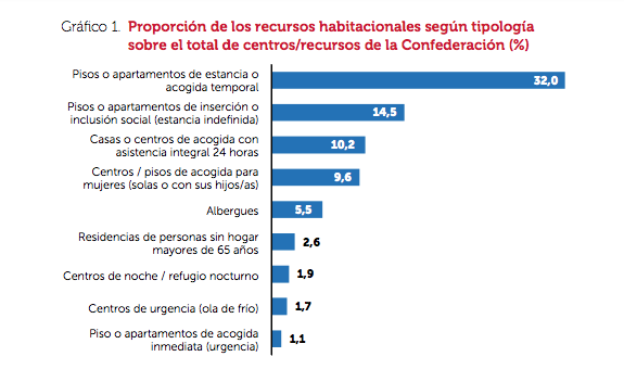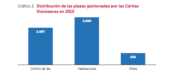 Según los datos del pasado año, la mitad de estas plazas (2.700) son de tipo habitacional: centros de acogida y asistencia integral, pisos de acogida temporal, centros de noche, centros de acogida para mujeres solas o con sus hijos, o pisos de inclusión social de estancia indefinida, entre otros.