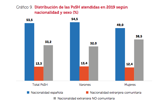El estudio de Cáritas rompe una vez más con el manido mensaje de algunos sectores de que la ONG de la Iglesia solo ayuda a personas migrantes. Y es que el 53,5% de las personas en situación de calle acompañadas son de nacionalidad española. Del 46,5% restante extranjeras, siete de cada diez son extracomunitarias y tres de cada diez son ciudadanos de la Unión Europea.