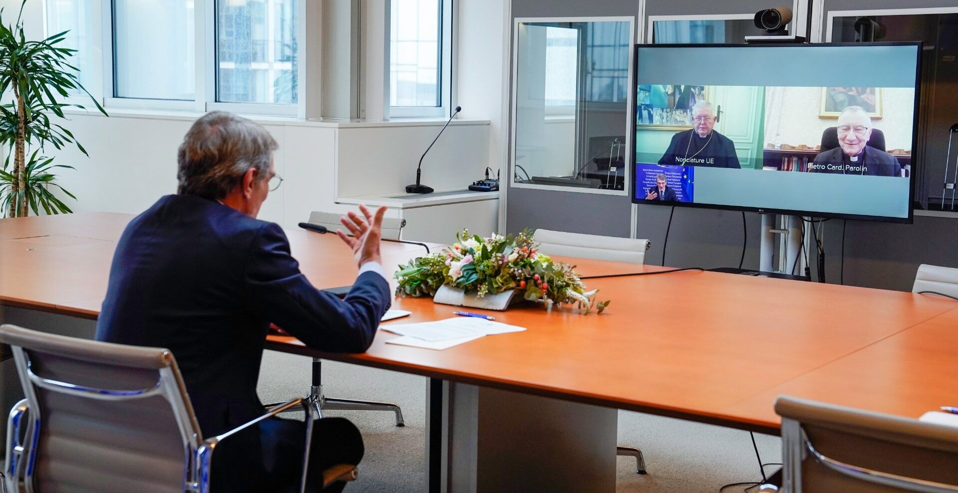 Esta reunión estaba previsto que fuera presencial, según informó la agencia SIR, pero la situación sanitaria europea por la pandemia del coronavirus han hecho que se optase finalmente por la videoconferencia conectando el parlamento de Bruselas, el Vaticano y la nunciatura de la Unión Europea ante las instituciones comunitarias. Se espera que el propio Parolin participe en noviembre en una reunión prevista en Estrasburgo, con motivo del 50º aniversario de la presencia del Observador Permanente de la Santa Sede ante el Consejo de Europa.