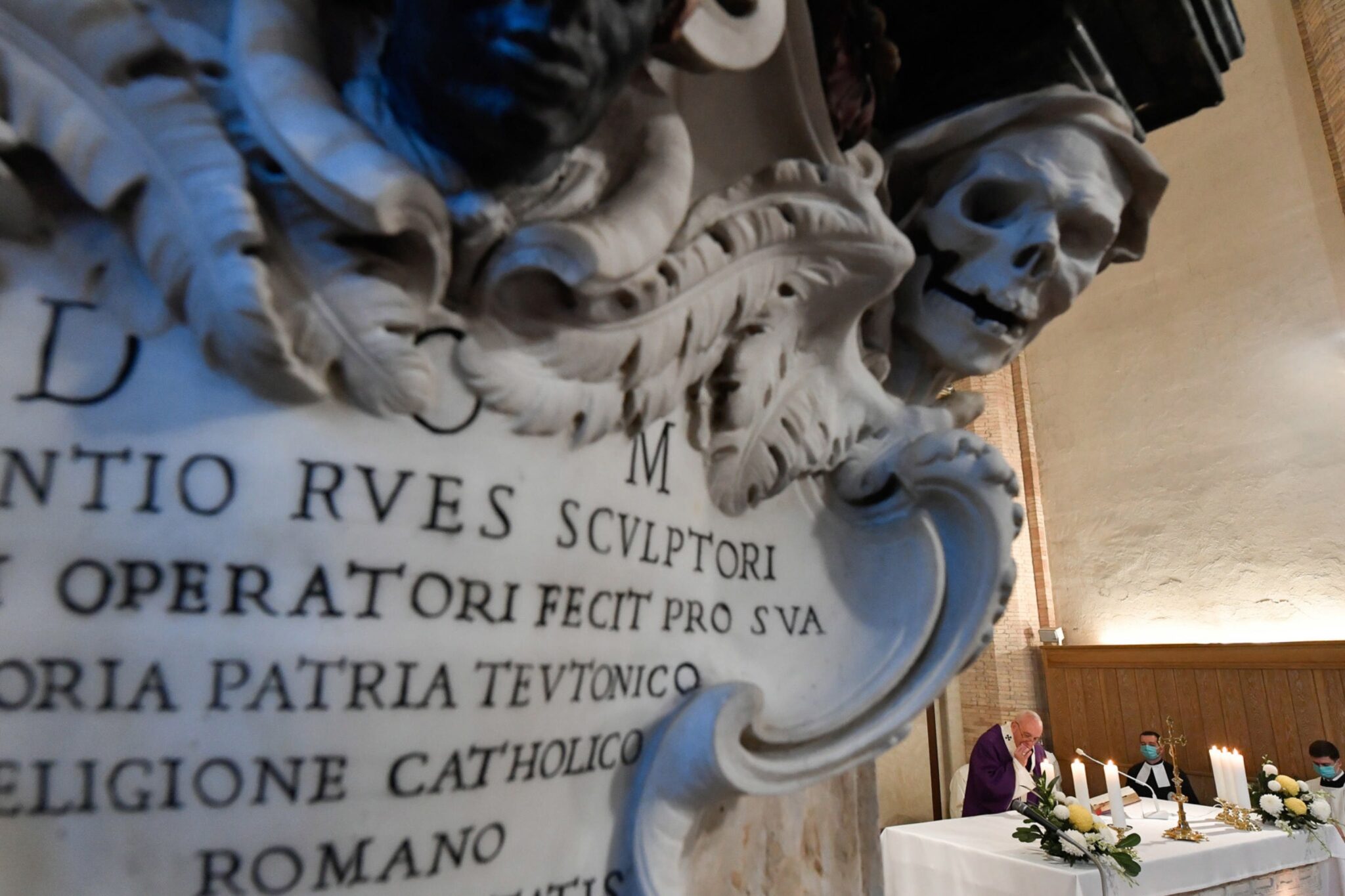 Vatican City (Vatican City State (holy See)), 02/11/2020.- A handout picture provided by the Vatican Media shows Pope Francis' Holy Mass in the Church of the Pontifical Teutonic College in Rome, Italy, 02 November 2020. (Papa, Italia, Roma) EFE/EPA/VATICAN MEDIA HANDOUT HANDOUT EDITORIAL USE ONLY/NO SALES