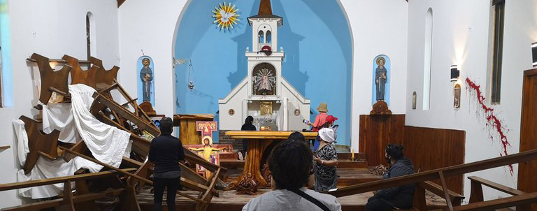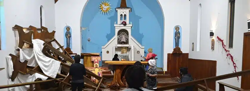 Además, los usurpadores destrozaron las instalaciones, mancharon las paredes, rompieron los bancos y arruinaron las imágenes sagradas. Dejaron panfletos y una bandera argentina, pintada de rojo.