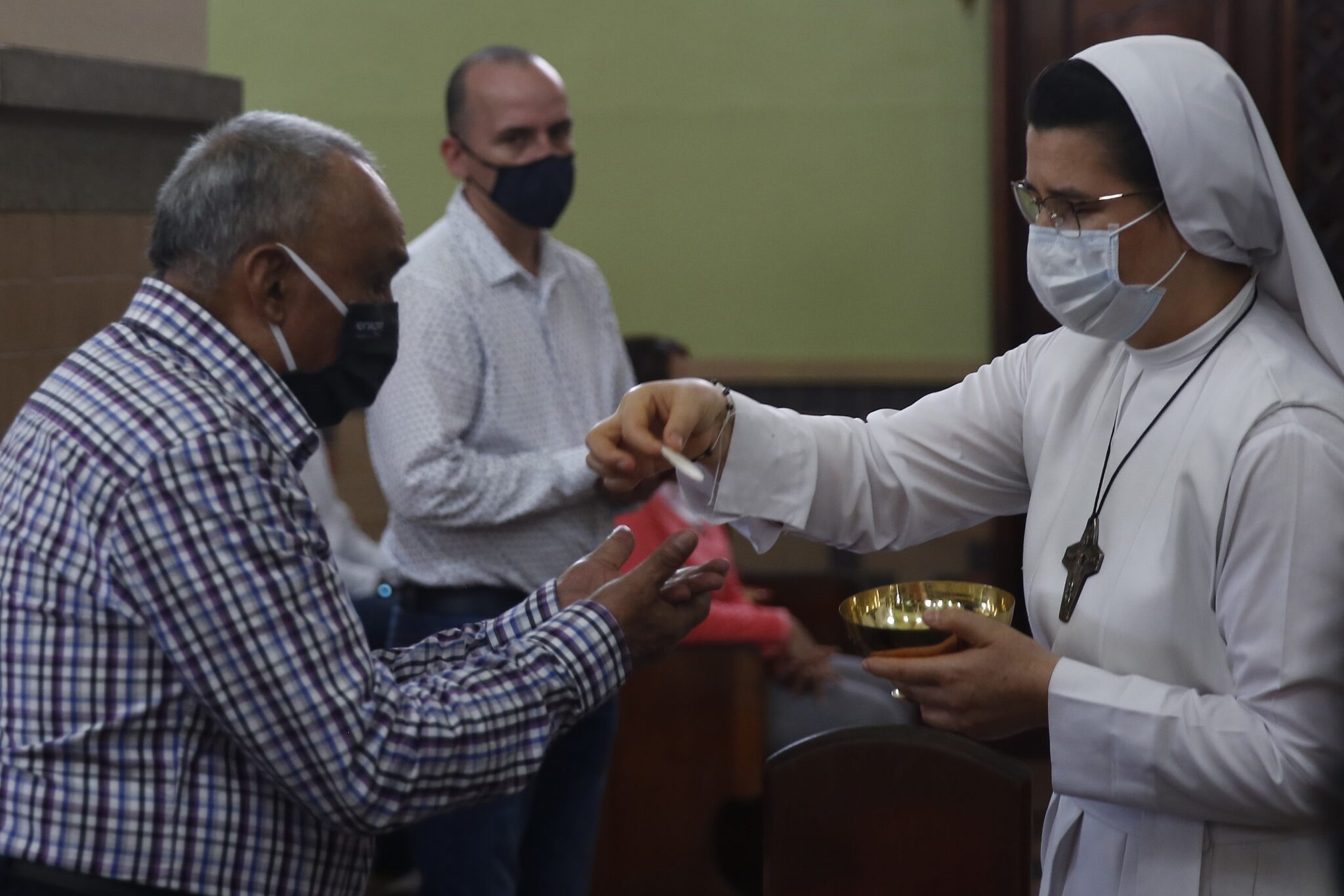 MED116. MEDELLÍN (COLOMBIA), 01/09/2020.- Una religiosa da la comunión a un feligrés en la Iglesia Santa Gertrudis, hoy en Envigado (Colombia). Las iglesias abrieron de nuevo sus puertas para ofrecer sus servicios religiosos tras ser cerradas en marzo pasado por la emergencia provocada por la pandemia de la COVID-19. EFE/ Luis Eduardo Noriega A.