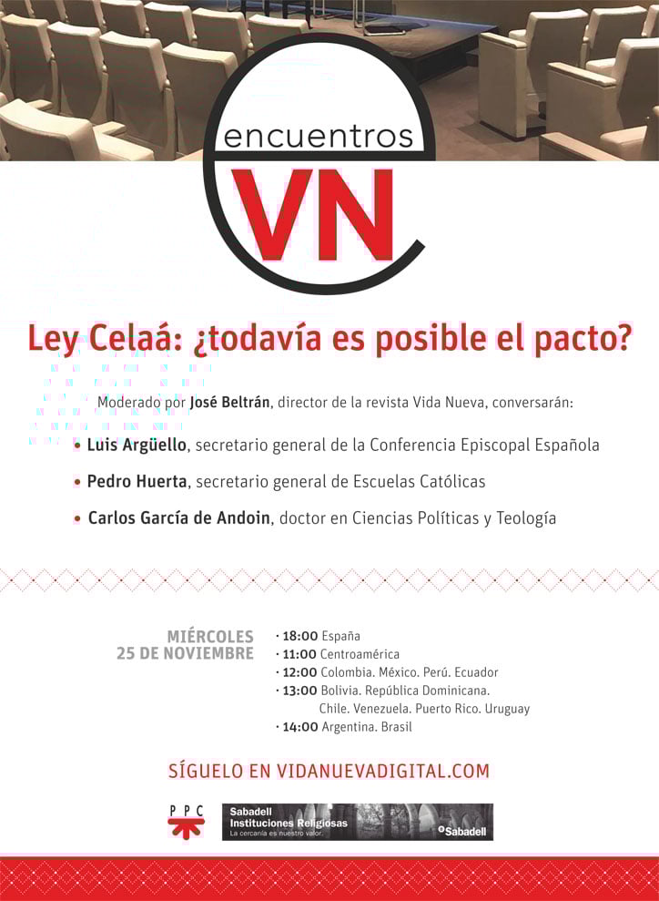Vida Nueva presenta el próximo 25 de noviembre una mesa redonda online bajo el título ‘Ley Celaá: ¿todavía es posible el pacto?’. El IV Encuentro Vida Nueva, organizado por la revista, con la colaboración de PPC y de la mano de Banco Sabadell, será de nuevo online, debido a las limitaciones de aforo por la pandemia del coronavirus. El evento podrá ser seguido a través de esta web. Será a las 18:00 horas (España).