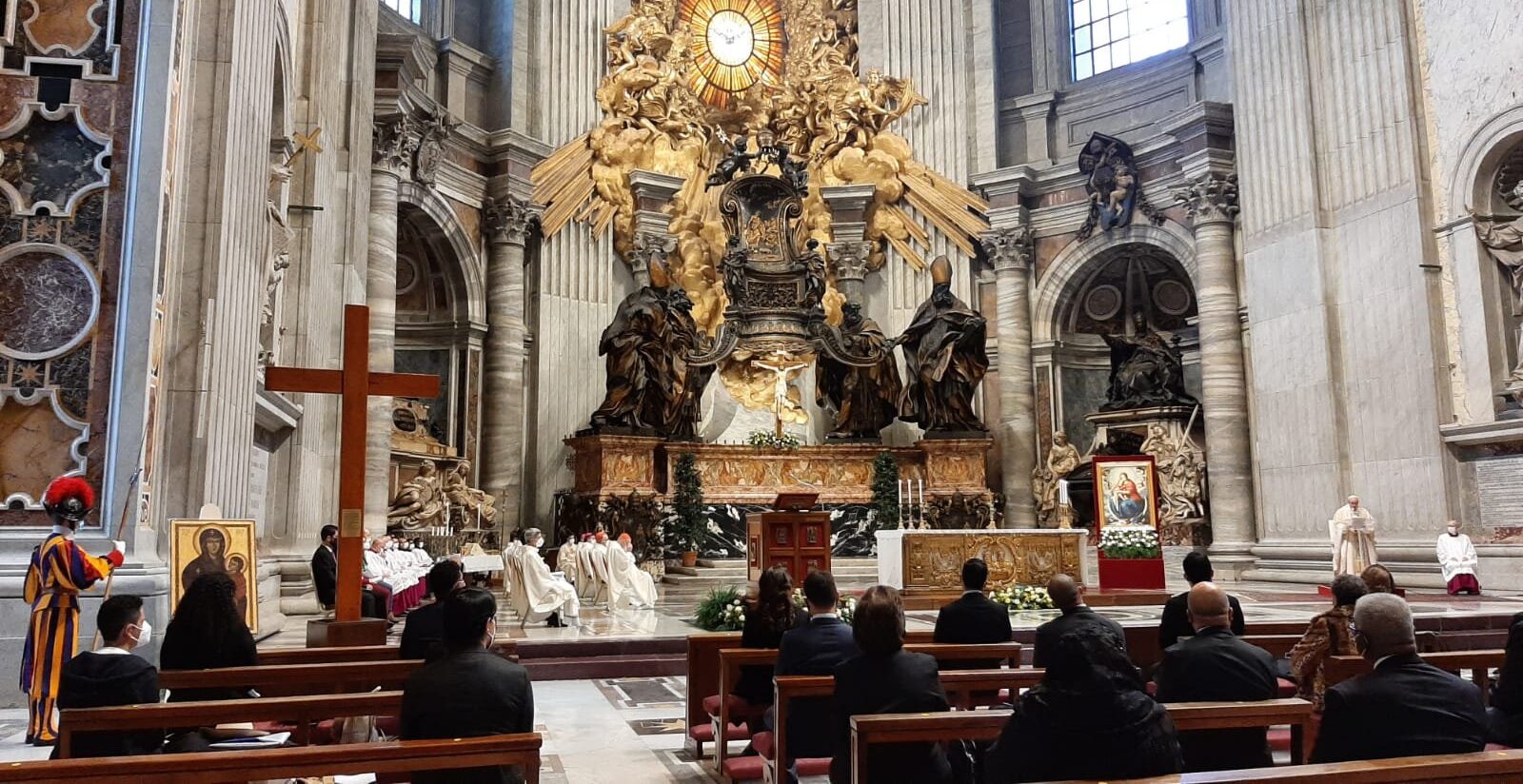 “Justo hoy estaba prevista la entrega de la cruz por los jóvenes de Panamá a los de Lisboa. Este evocador gesto se aplaza al domingo de Cristo Rey, el próximo 22 de noviembre. A la espera de ese momento, os exhorto a vosotros, jóvenes, a cultivar y dar testimonio de la esperanza, la generosidad y la solidaridad que todos necesitamos en estos tiempos difíciles”, anunciaba el papa Francisco en el solitario ángelus del Domingo de Ramos, el 5 de abril de 2020. Así se ha cumplido esta mañana en una misa con todas las prevenciones sanitarias por el coronavirus en el Altar de la Cátedra de la basílica vaticana cuando, antes de concluir la eucaristía los jóvenes portugueses recibieron la cruz y el icono mariano que custodiarán hasta 2023 cuando se celebre la JMJ número 38.