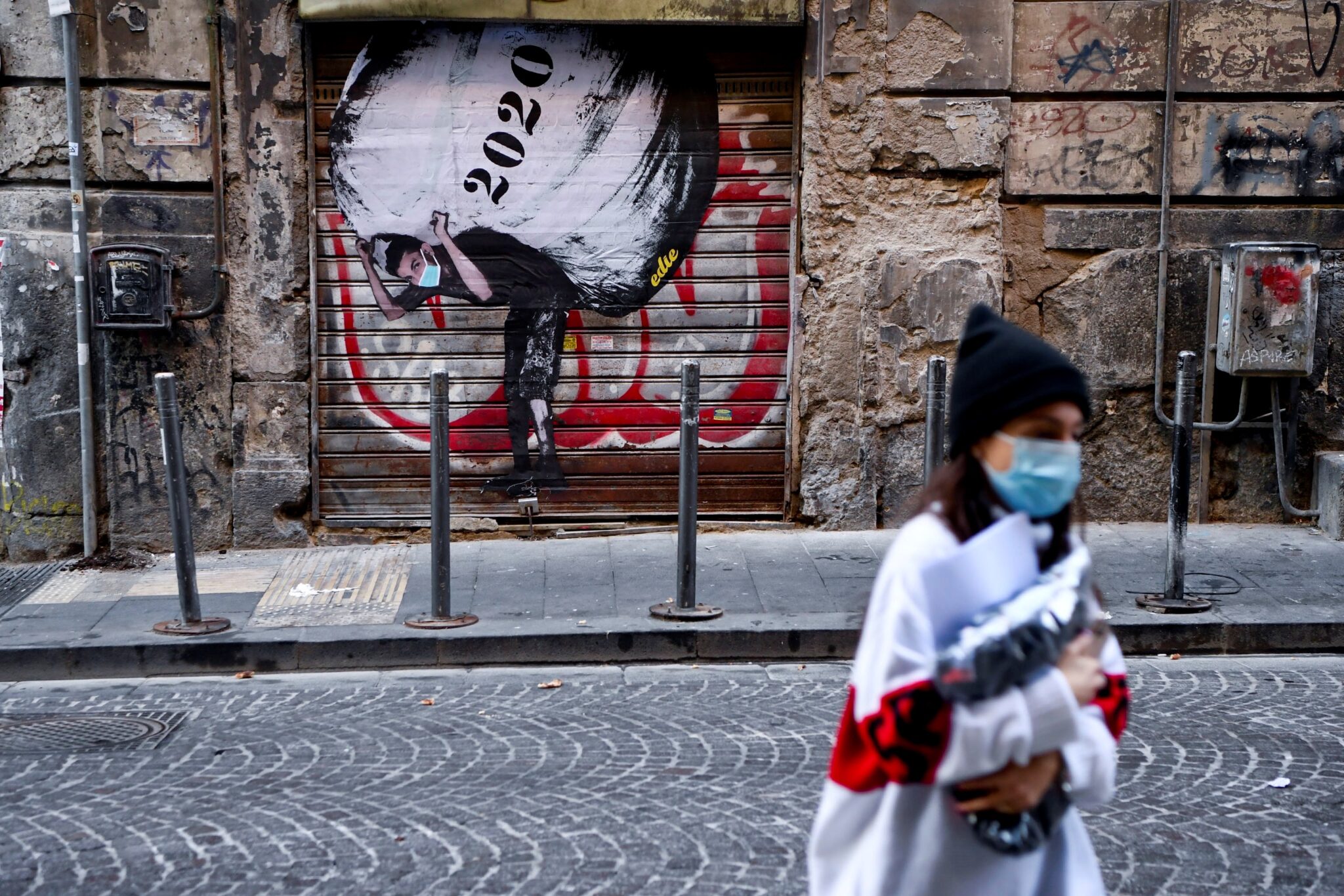 (Italy), 27/11/2020.- A street art showing the Year 2020 as a heavy burden carried by a young man in an anti-contagion mask in Naples, Italy, 27 November 2020. (Italia, Nápoles) EFE/EPA/CIRO FUSCO