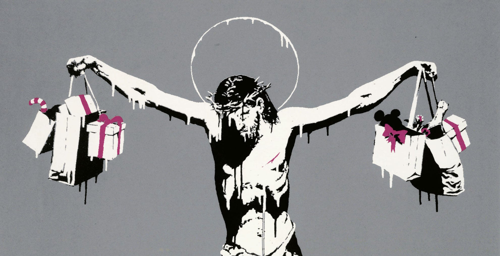 Sin embargo, no deja de ser una obra que, de algún modo, refleja que no se puede definir la trayectoria de Banksy frente a la religión, sino sobre lo que él –por supuesto– considera perversiones del mensaje de la fe. “Con esta imagen, Banksy sorprende y hiere al espectador. El fondo gris sugiere una sensación de ansiedad y desaliento. De las manos de Cristo cuelgan pesadas bolsas con regalos como juguetes de Disney y bastones de azúcar. Los paquetes están decorados con una brillante cinta de color rosa, pero de la parte baja de estos gotea pintura negra, lo que nos recuerda a la sangre derramada por Jesús”, prosigue el texto acerca de la obra que firma, como todos, Nachkebiya.