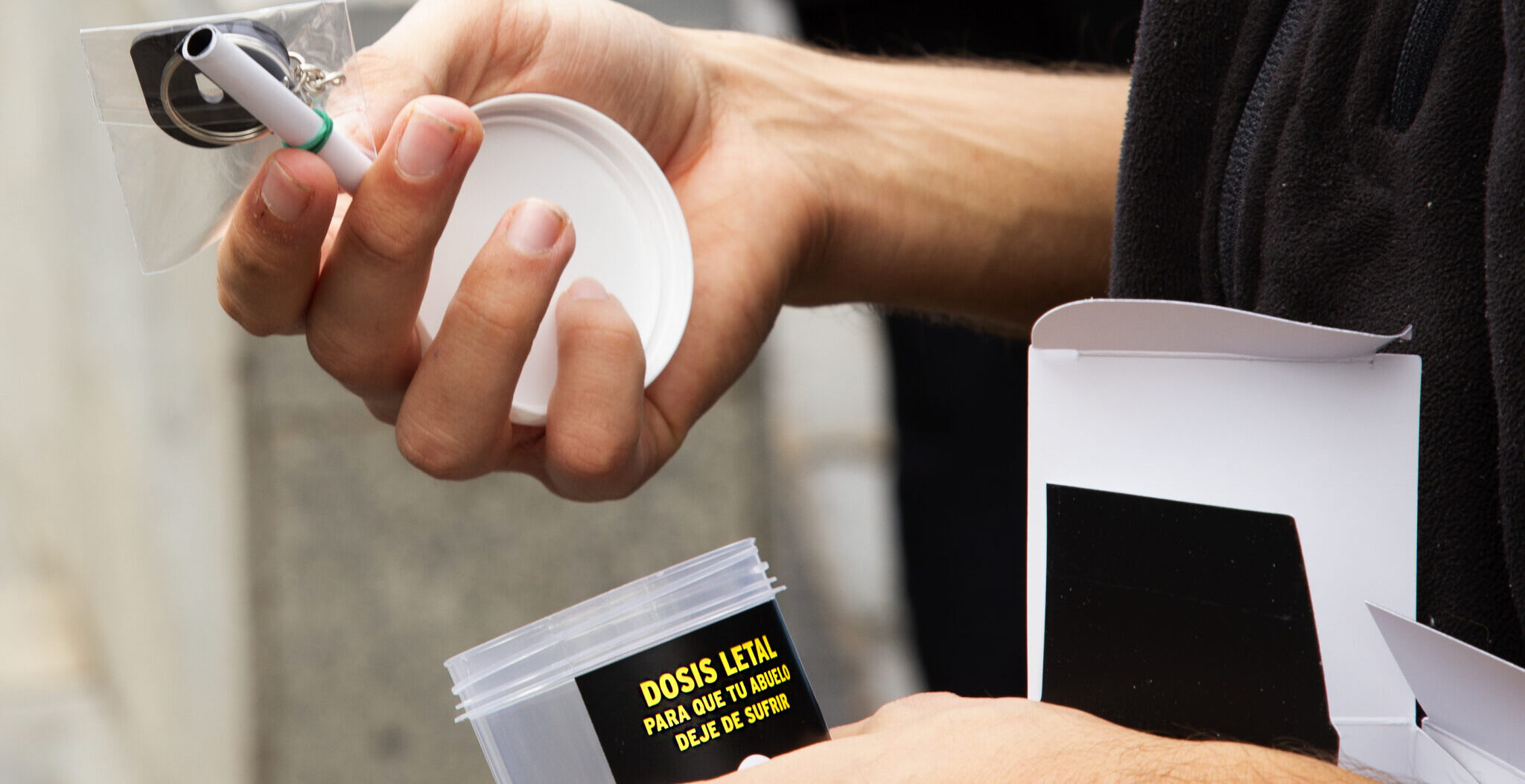Las “dosis letales” son unos pequeños frascos que simulan ser un medicamento en el que se incluyen eslóganes provocadores del tipo: “Tu abuelo no necesita una dosis letal, tu abuelo necesita cuidados paliativos y el afecto de sus nietos”.