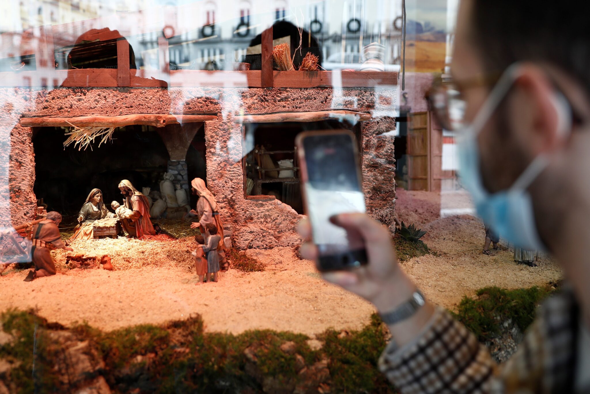 -FOTODELDÍA- MADRID, 02/12/2020.- Varias personas observan el belén de la Real Casa de Correos, que este año está situado en el exterior de la Real Casa de Correos de Madrid, y que hoy ha sido inaugurado por la presidenta de la Comunidad, Isabel Diaz Ayuso. EFE/ Mariscal