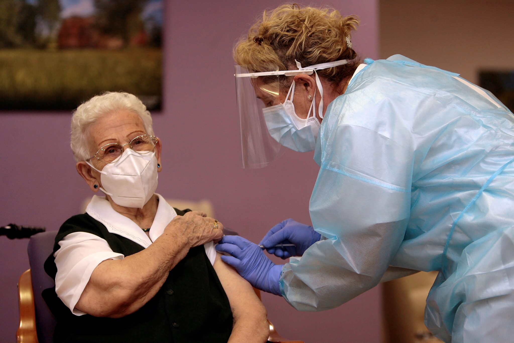 GUADALAJARA, 27/12/2020.- Araceli, una mujer de 96 años, residente en el centro de mayores Los Olmos de Guadalajara capital, ha recibido a las 9.00 horas la primera dosis de la vacuna en España. Tras ella será vacunada una trabajadora de 40 años de la misma residencia. Con estas dos inyecciones se inicia este domingo en España la esperada estrategia de vacunación contra el coronavirus que se seguirá en todas las comunidades autónomas. EFE/Pepe Zamora POOL