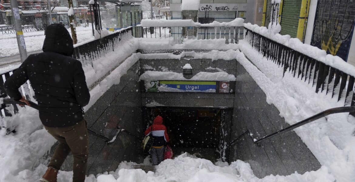 MADRID, 09/01/2021.- Acceso al metro de Urgel, Carabanchel, Madrid, este sábado en el que la península sigue afectada por el temporal Filomena que deja grandes nevadas y temperaturas más bajas de lo habitual que bajarán drásticamente los próximos días. EFE/Mariscal
